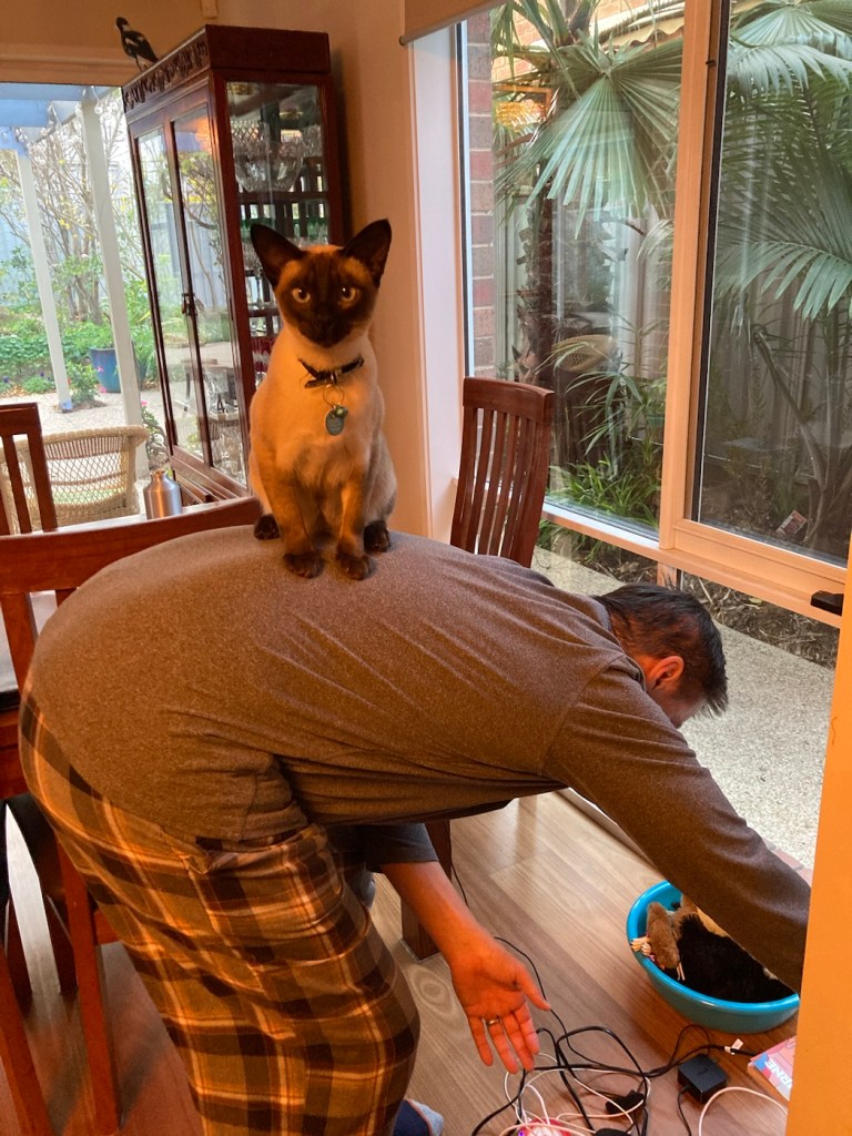 Crumble keeps us on our toes. He is a jumper/explorer, who tries to jump up the front of you and likes to leap onto our backs when we are bent over fiddling with our converter plug that is on its last legs.