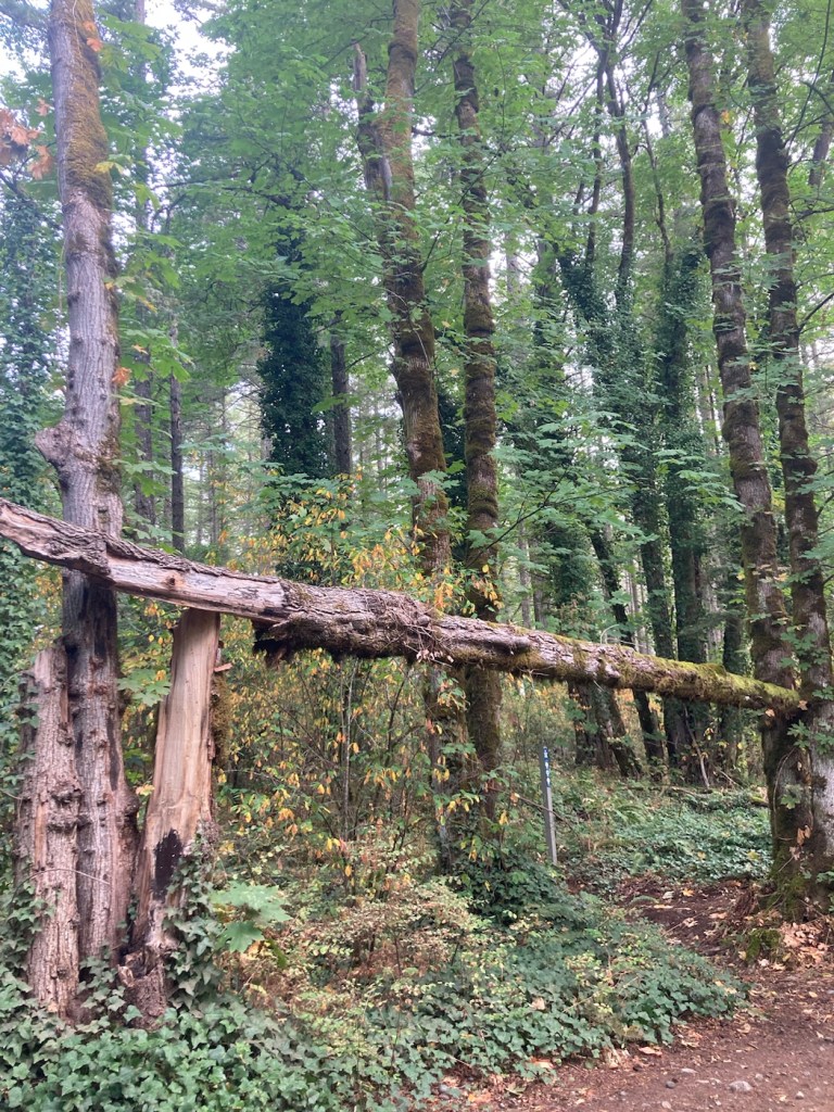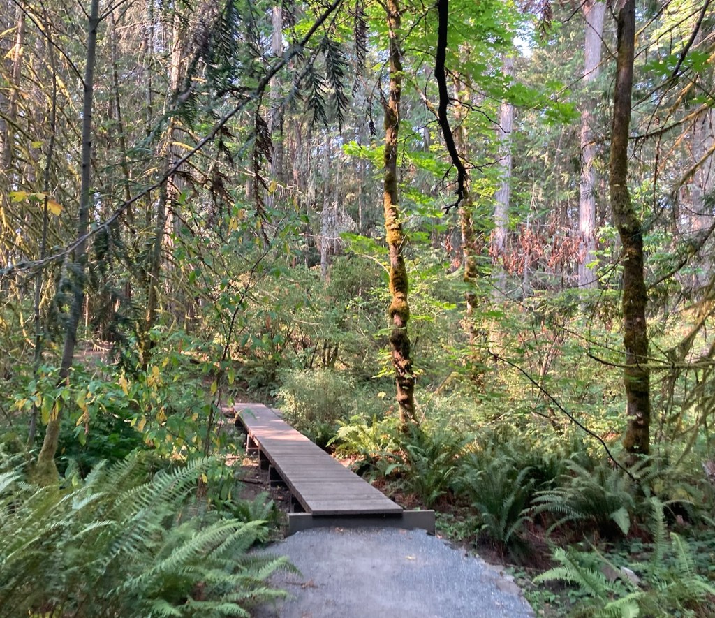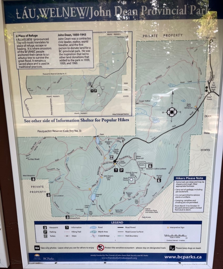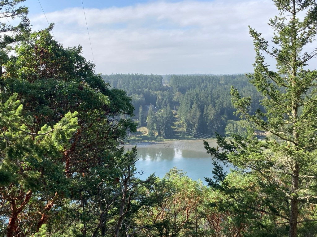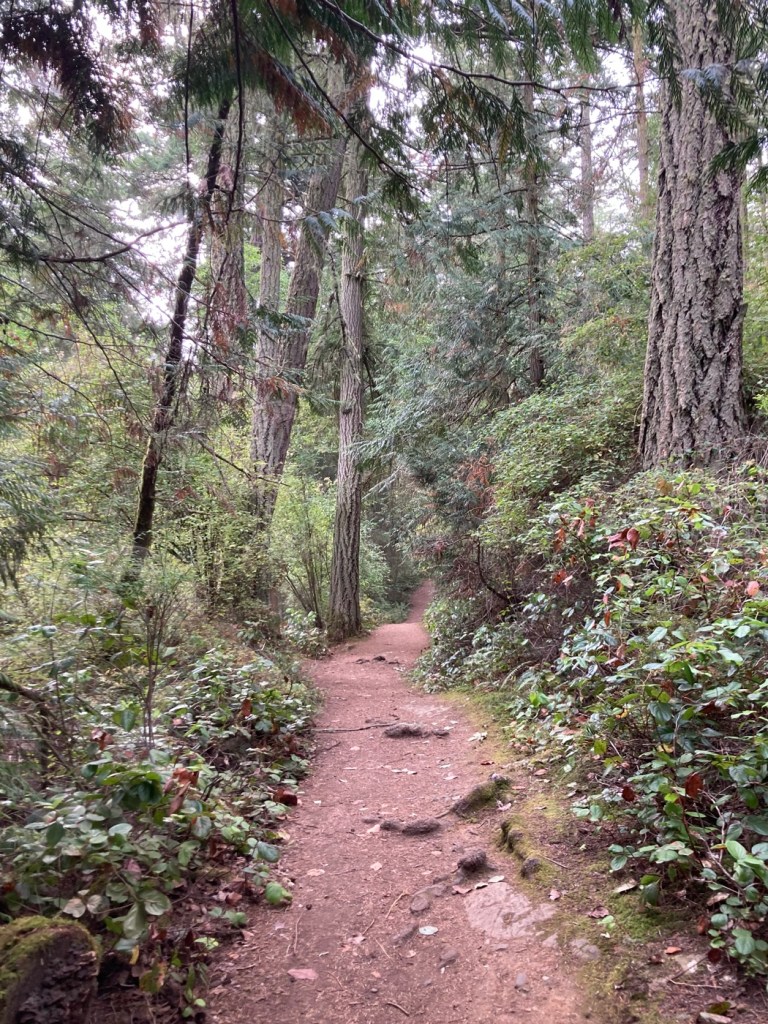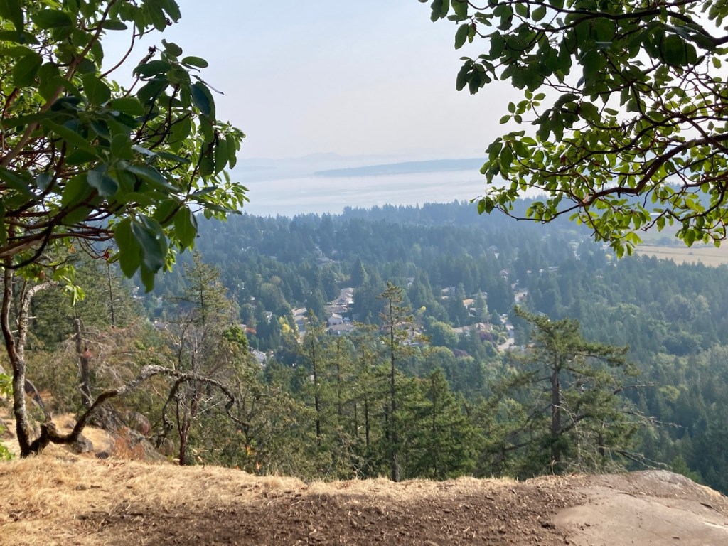Today, we had a good walk around many trails at John Dean Provincial Park. From the website, the park is “situated on top of Mount Newton on Southern Vancouver Island and overlooks the pastoral Saanich Peninsula, the Gulf Islands, and the Cascade Mountains.” We headed toward a viewpoint, but t was a bit obscured with the still smoky air.