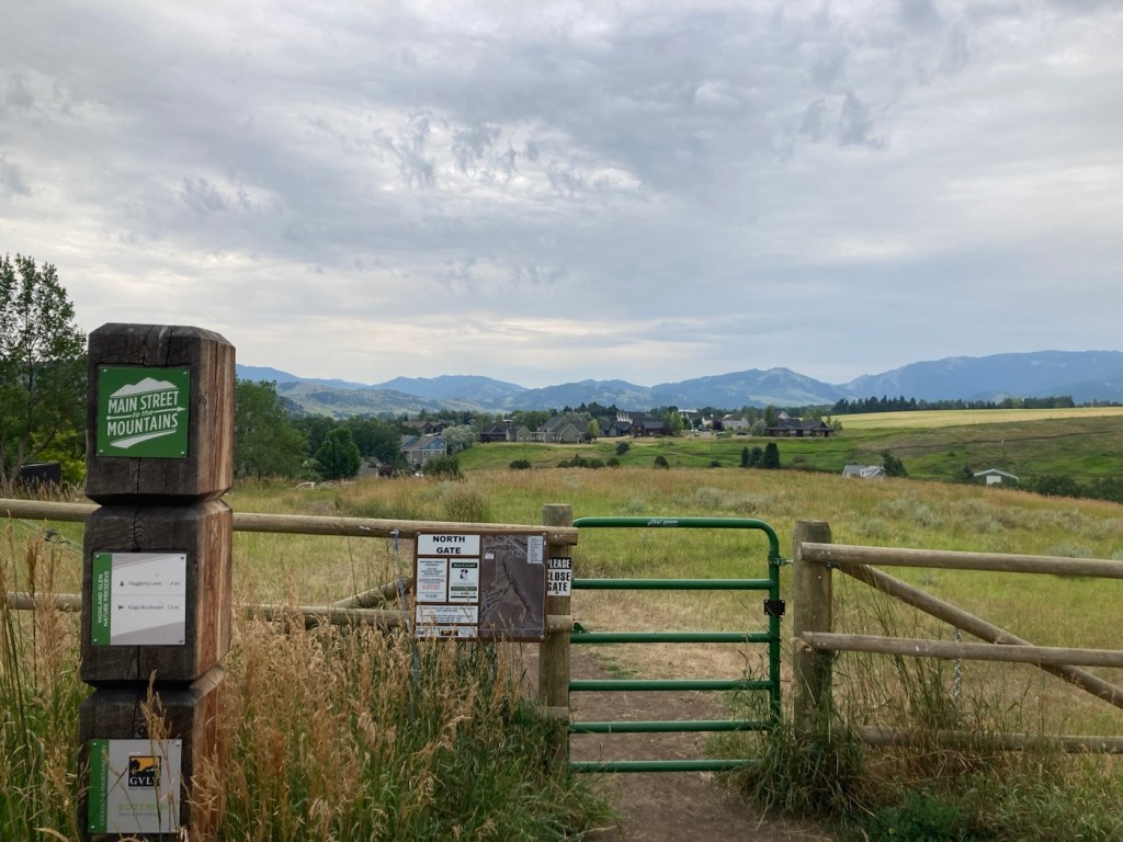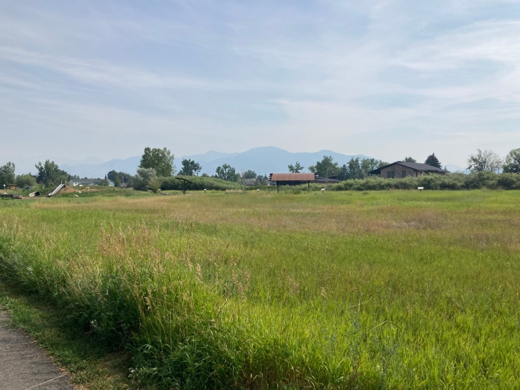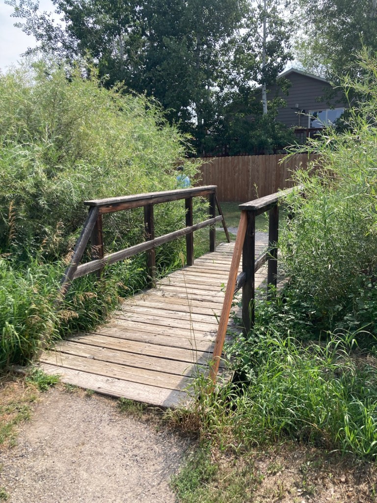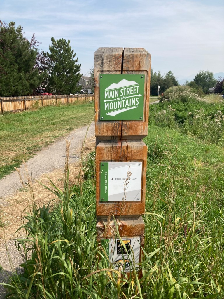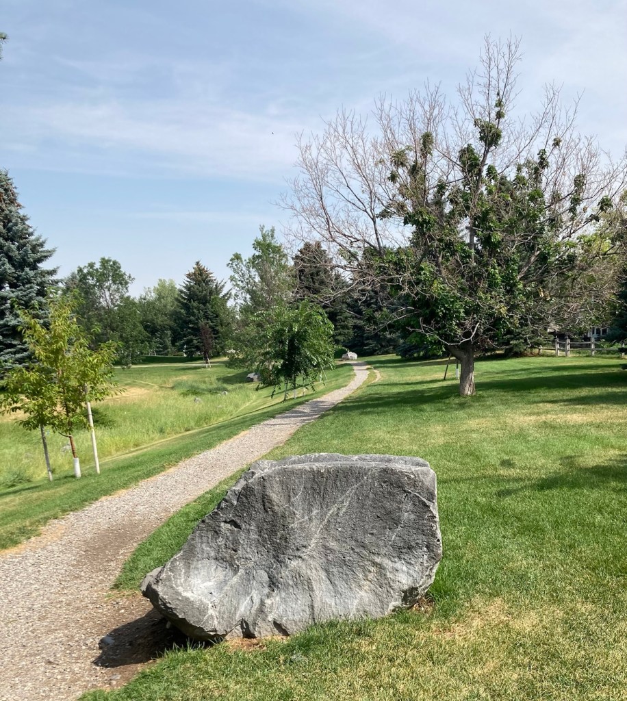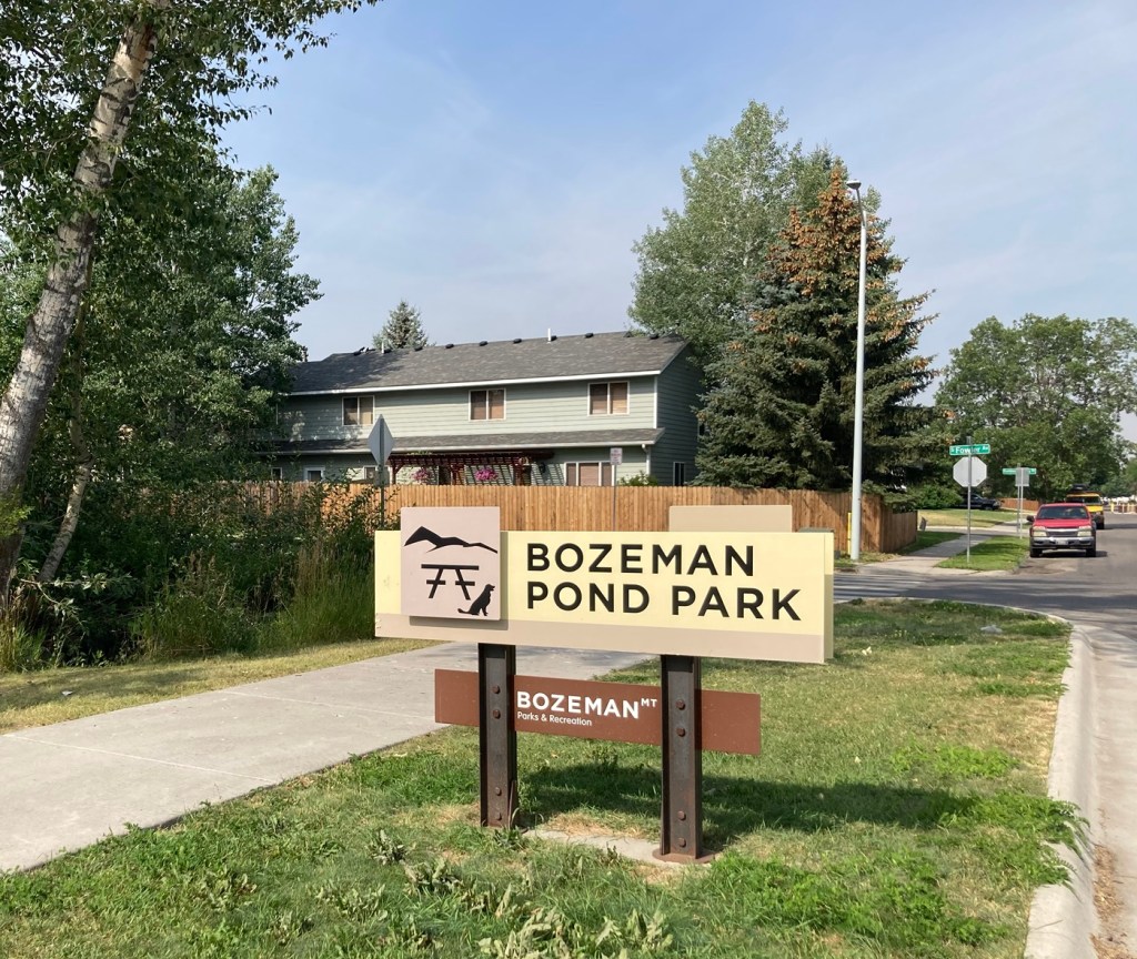 The sign for the parkAn interesting location for a slideLooking back across the first section of the park towards the Bridger Mountains The fishing pond. You can see a dog in for a swim with his human on the side in blue.Another sign for the pond and also the Optimist Club that sponsors an annual youth fishing derby at the pondA rock climbing wall in the parkAnother view of the fishing pond with some benches Signage for the Main Street to the Mountains system and directions for the West Side TrailSome runners passing us on the trail, which was mostly gravel.One of the small bridges along the pathA unique little library or pantry, we didn’t look inside.Some of the lovely greenery along the pathAnother view of the path. This part had these big stones alongside it.Some lovely newer homesComing to the end of the urban path