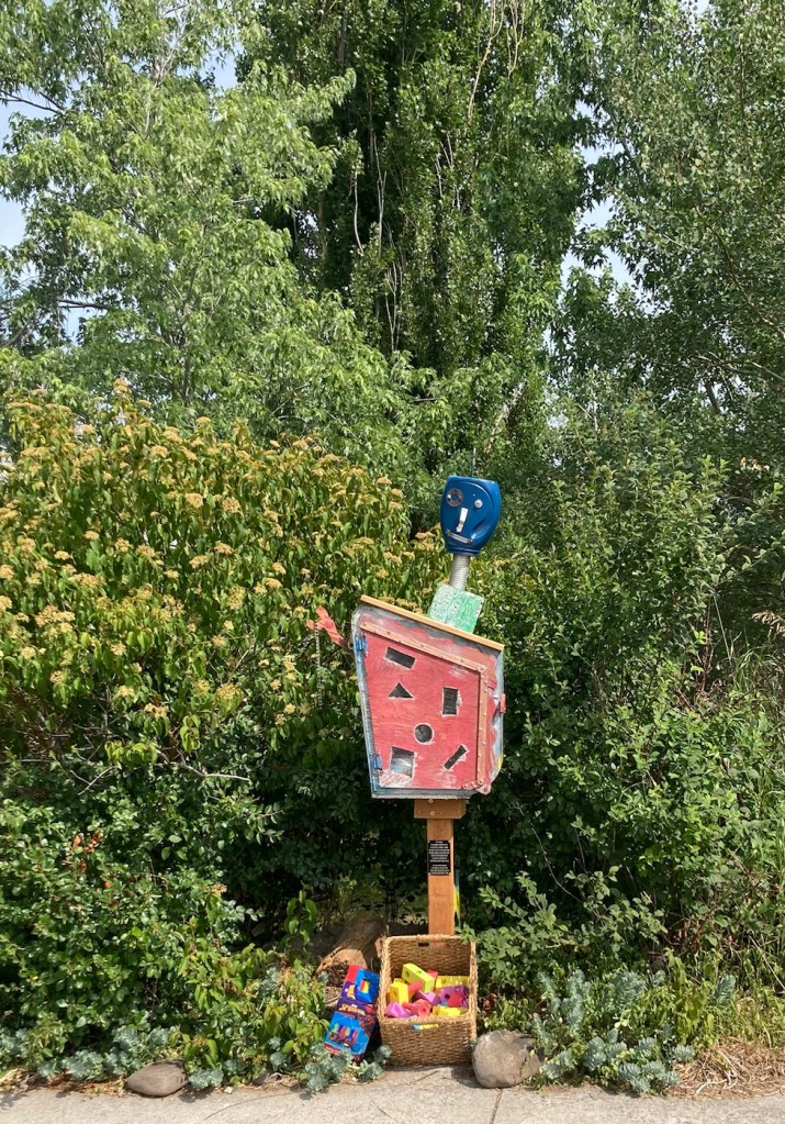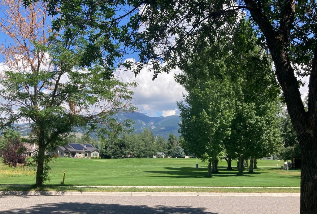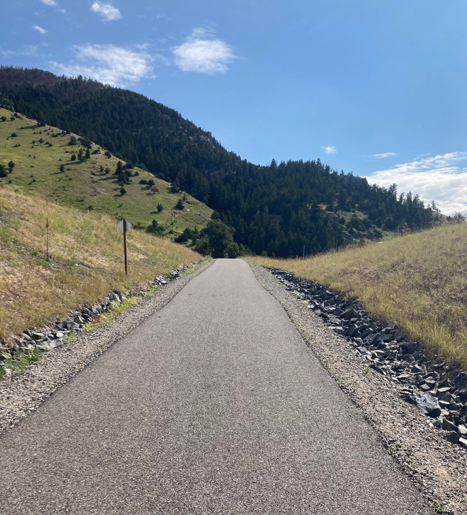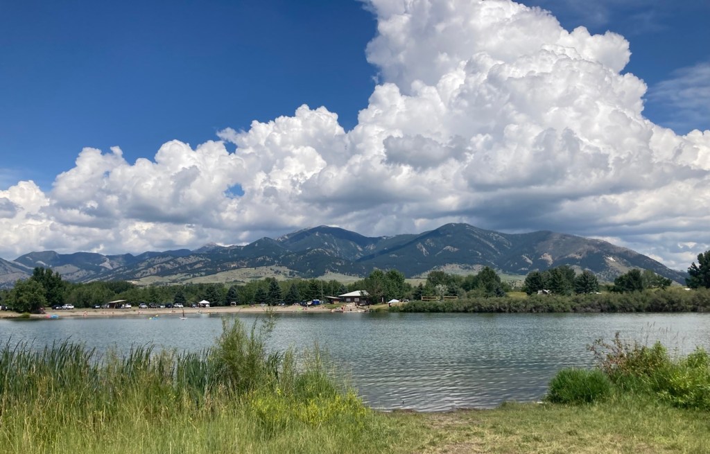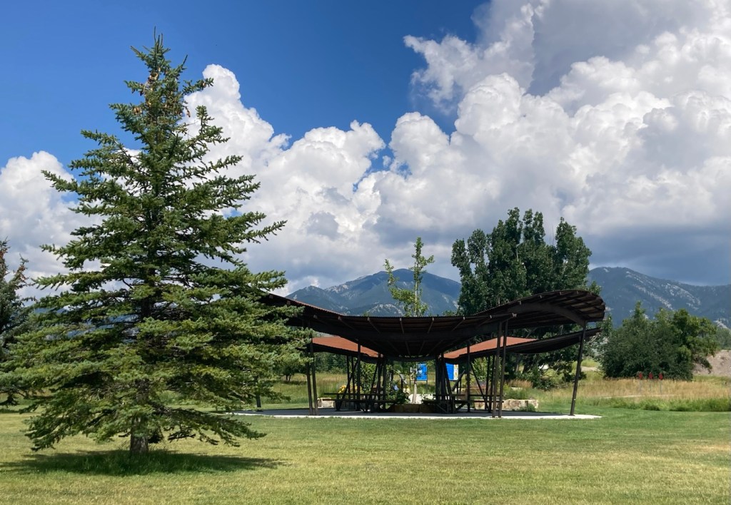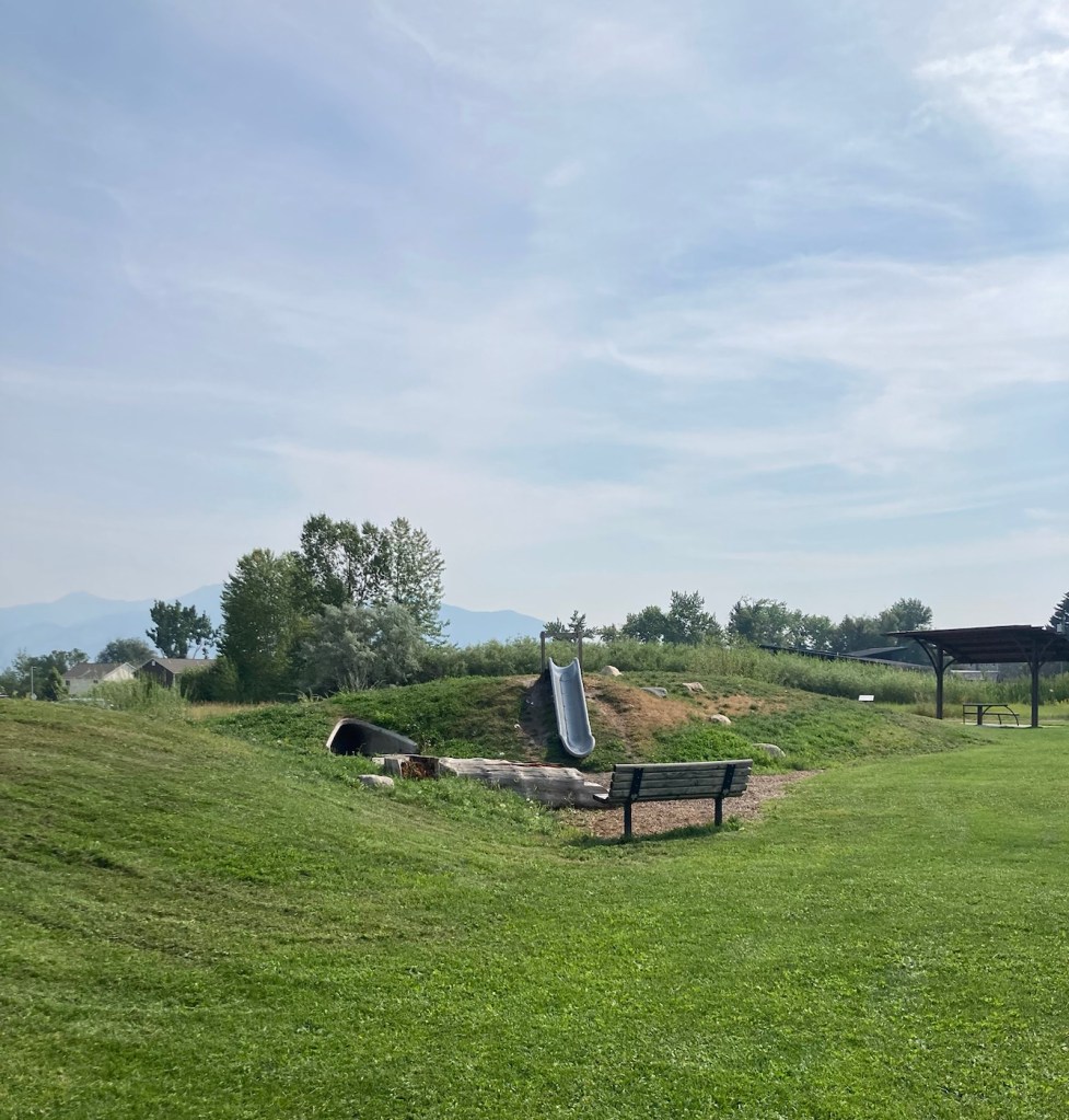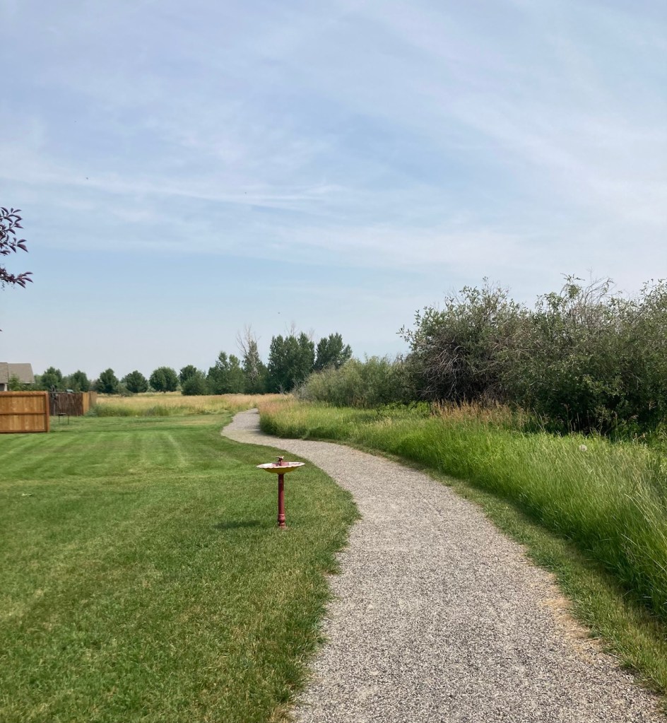 The sign for the parkAn interesting location for a slideLooking back across the first section of the park towards the Bridger Mountains The fishing pond. You can see a dog in for a swim with his human on the side in blue.Another sign for the pond and also the Optimist Club that sponsors an annual youth fishing derby at the pondA rock climbing wall in the parkAnother view of the fishing pond with some benches Signage for the Main Street to the Mountains system and directions for the West Side TrailSome runners passing us on the trail, which was mostly gravel.One of the small bridges along the pathA unique little library or pantry, we didn’t look inside.Some of the lovely greenery along the pathAnother view of the path. This part had these big stones alongside it.Some lovely newer homesComing to the end of the urban path