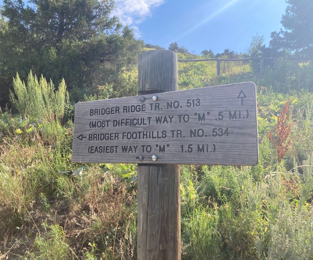 The Montana State University MFrom the parking lot, we walked a short distance on the Main Street to Mountains hike/bike path that ends at the M trailhead Being shamed by a sign for our trail selection Looking back towards Bozeman Forest management offices and more mountains across the road from the M.A new house with great views next to the M mountain More homes near the mountainThe path upA happy blue and green viewA few minutes before this pic, this dog was in the woods beside us, and we were afraid we had our first grizzly sighting. Another peak at Bozeman The park offices and homes from higher up (not to mention the lovely surroundings)Me taking the above photoThe side view of the top of the M