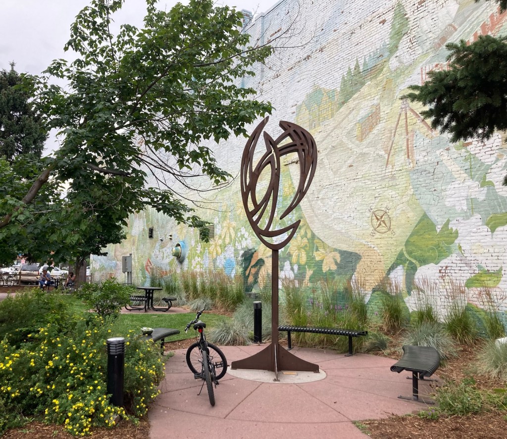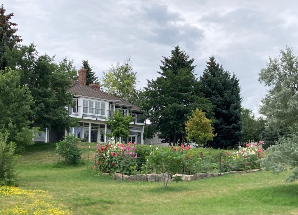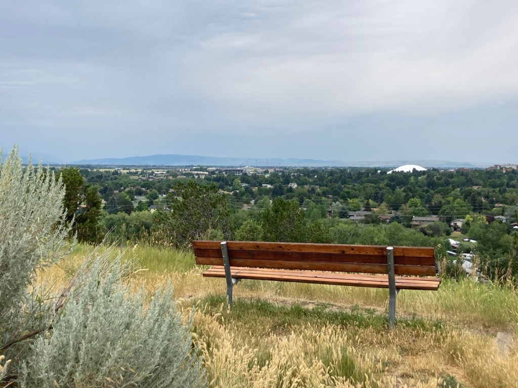 Heading up Peet’s HillA view of Bozeman as we ascendedA view of the Bridger Mountains from atop Peet’s HillLoved the different textures and colorsZooming in to get the MContinuing through the park toward a residential areaA bench for gazing. The white dome is the practice field on the MSU campus.Some of the homes along the pathMore houses with great views Love this scenery!Another view from further on, looking towards the university areaAt the end of Burke Park, we walked along a busy road until we joined up with another trail. I liked the flowers in this yard.Walking back towards the library/sculpture park from a trail near the Highland Glen Nature Preserve a bit southeast of downtown Signage for and a gate into the Highland Nature PreserveAnother ski lift seat as sculpture, at least the 3rd one we’ve seen in Bozeman.