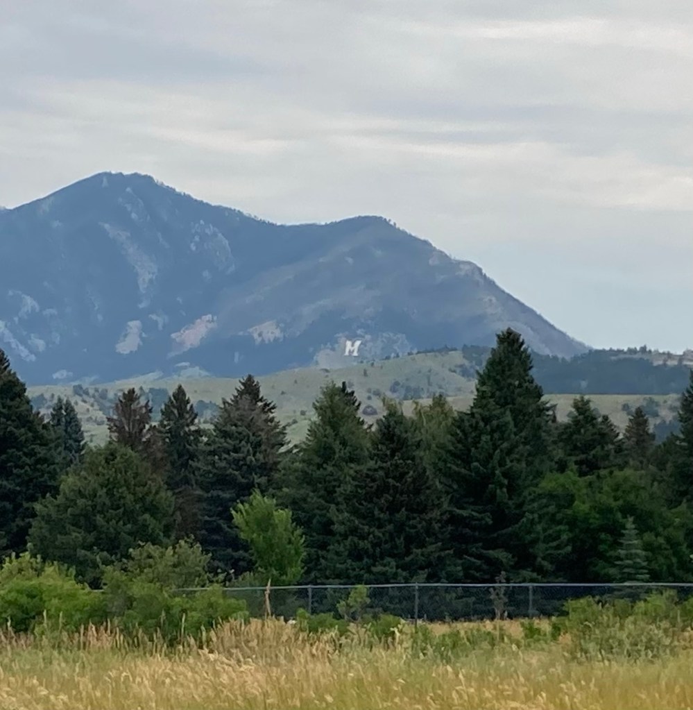 In 1915, Montana State University students created an M on a mountain at the mouth of Bridger Canyon. I’m not sure what it was originally made of, but it now consists of 250 feet of whitewashed rock. There are two routes up to it, one short (.5 miles) and steep, and the other longer (1.5 miles) and less steep. Both are popular for hiking and running, as we found when looking for a parking spot this morning.