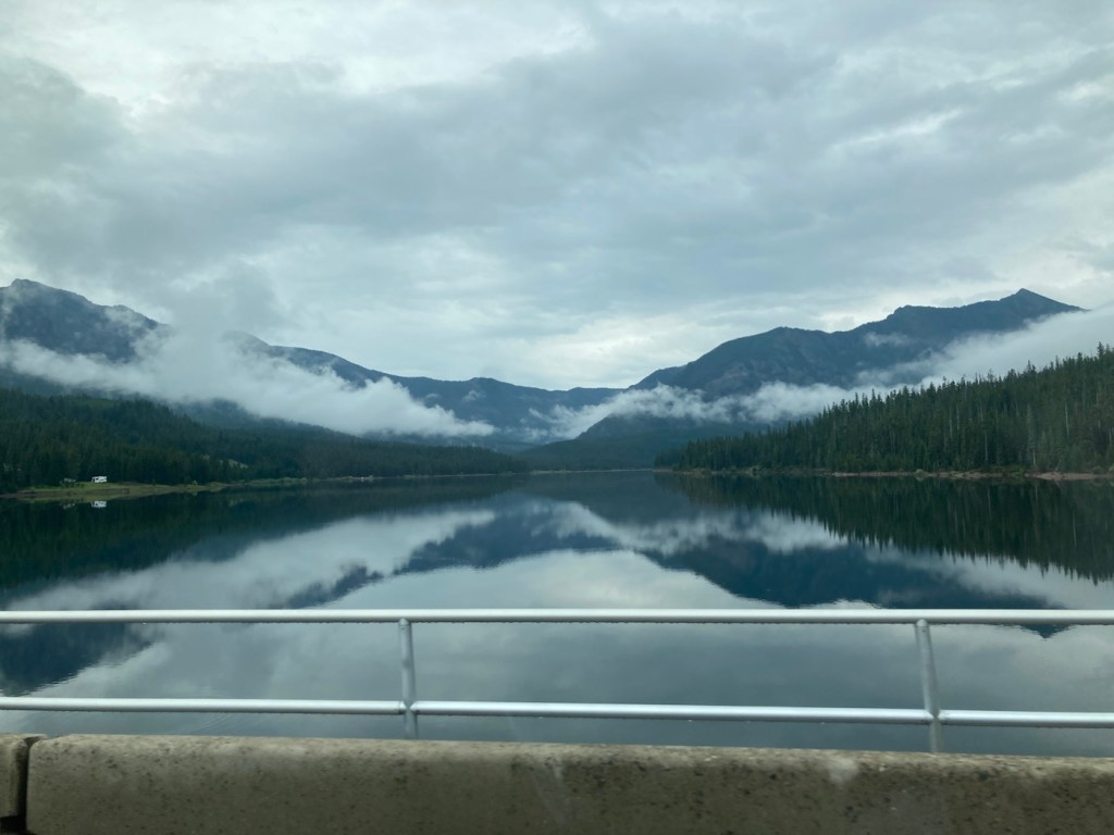 Driving by a fast flowing creek in the national forestOur first sighting of the Hyalite ReservoirAnother view of the reservoir from a pullout area
