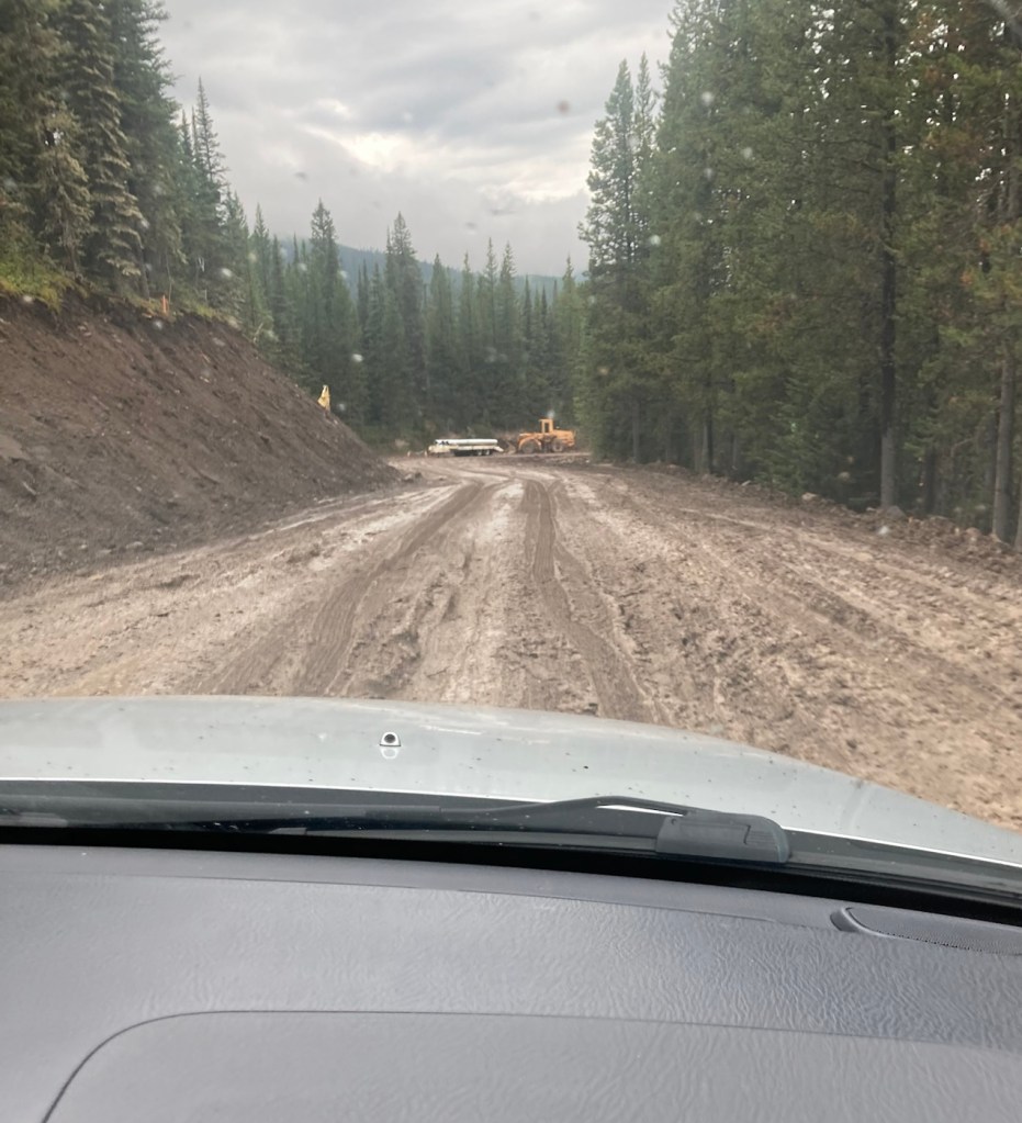 Before we left for the Palisade Falls, we had read that the road to the trailhead was currently only open on Saturday and Sunday. We didn’t know why, but I assumed this was just the most popular time to visit. That could be the reason, but they are also doing roadwork, or maybe creating a paved road from what is a dirt road now. You can see below that with the rain, the dirt had become mud, serious mud in some areas. We made it past the construction vehicles in the photo before things got even worse, and we decided that without 4-wheel drive it might be best to turn around before someone had to dig us out.