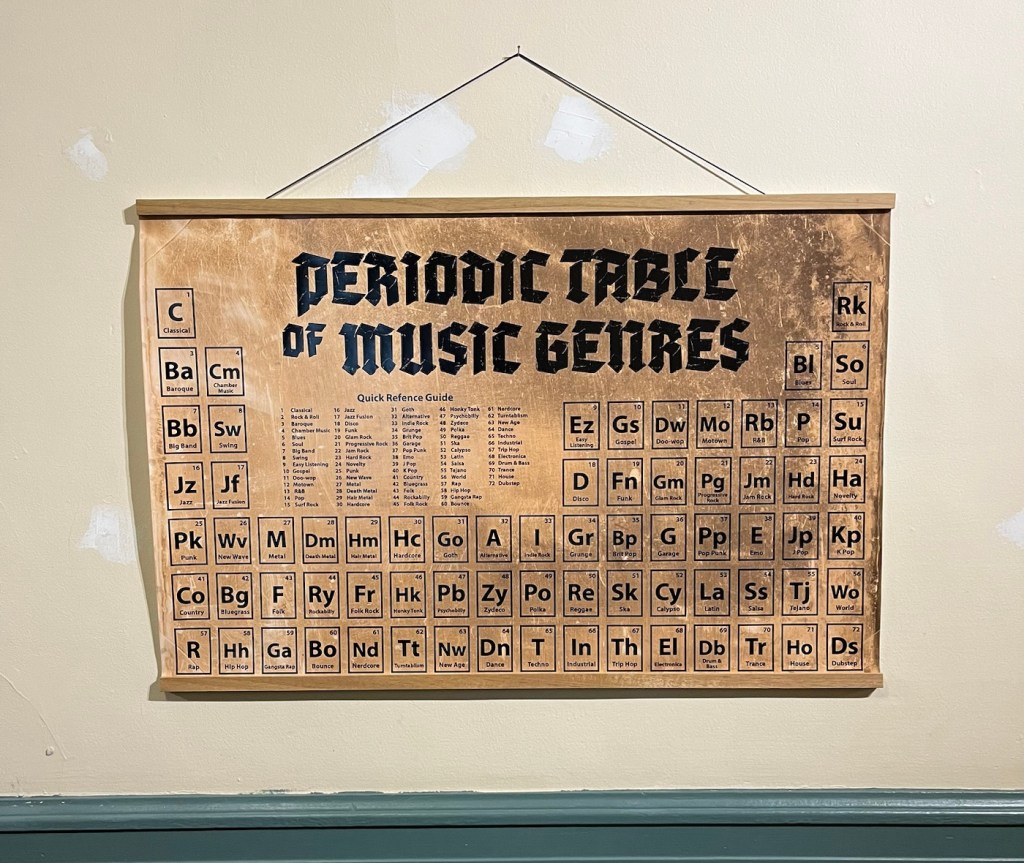 These are samples of stained glass windows created by Bozeman High School students in 1980.Sculptural ceramic pieces by Coco Costigan, a member/artist of the Artists’ Gallery in the Emerson Center.Tiles painted by students and put together to form a “quilt.”A very Montana-esque painting, with a signature that looks like SIL and 1981.A fun take-off on the periodic tableMaybe the restroom was occupied?
