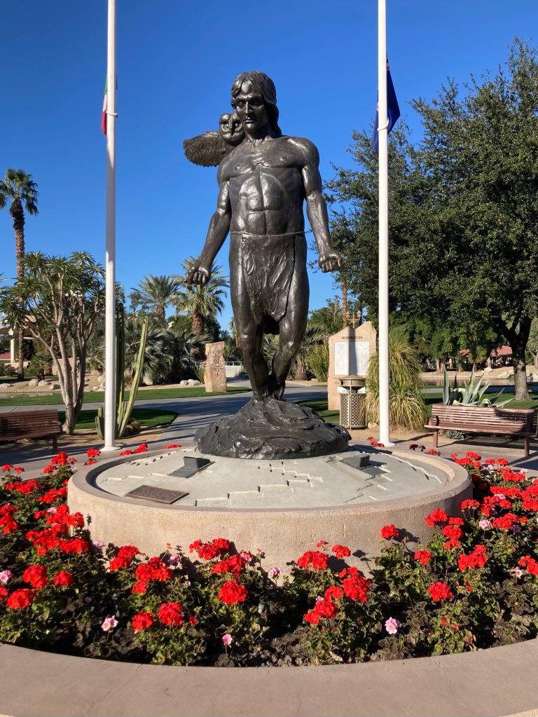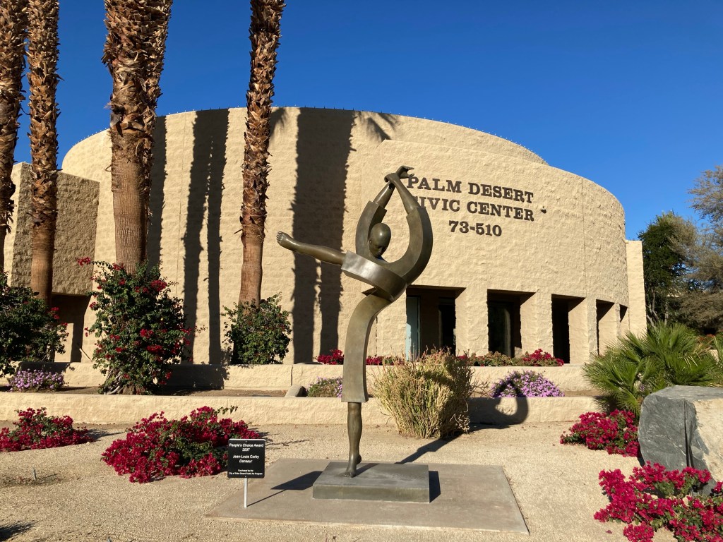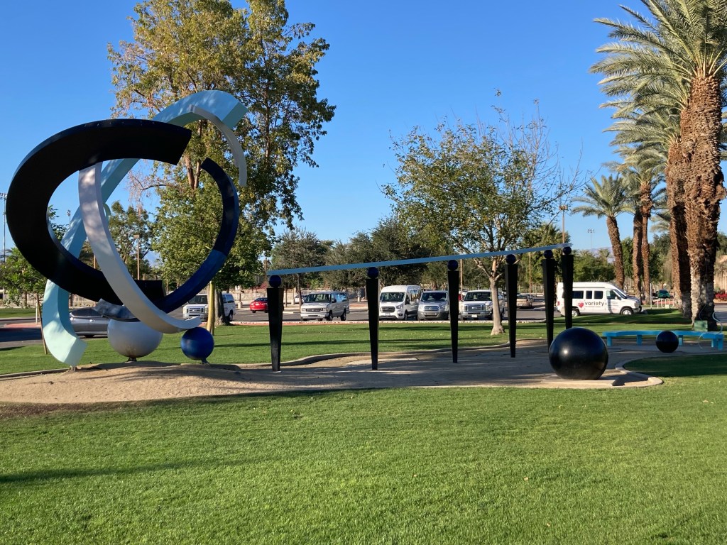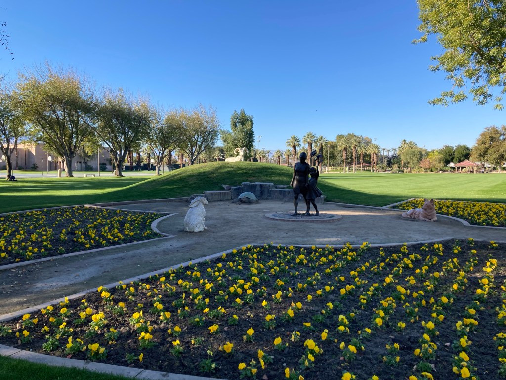 We were headed to the Civic Center Park to walk the public art trail. The Civic Center Park is a 70 acre park that is home to the city of Palm Desert municipal offices as well as recreational and sports amenities, five picnic pavilions, an amphitheater, two skate parks, and a dog park, along with the art walk. It is one of the most beautiful parks we have ever visited.