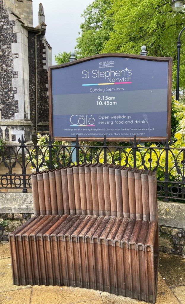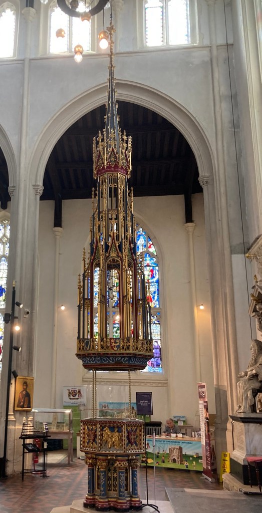 The tour guide stated that the Diocese of St Edmundsbury and Ipswich was created in 1914, which required the creation of a cathedral. Since this was at the end of WWI, followed by financial constraints and then WWII, the construction of the cathedral didn’t get started until after 1943 when Stephen Dykes Bower was selected as the architect. Normally, Ipswich, being the larger and the county seat, would have been the chosen location. However, all of the historic churches in Ipswich are located in the city center with no room for expansion, so the St James church in Bury was selected.