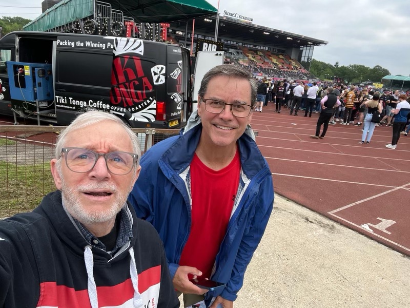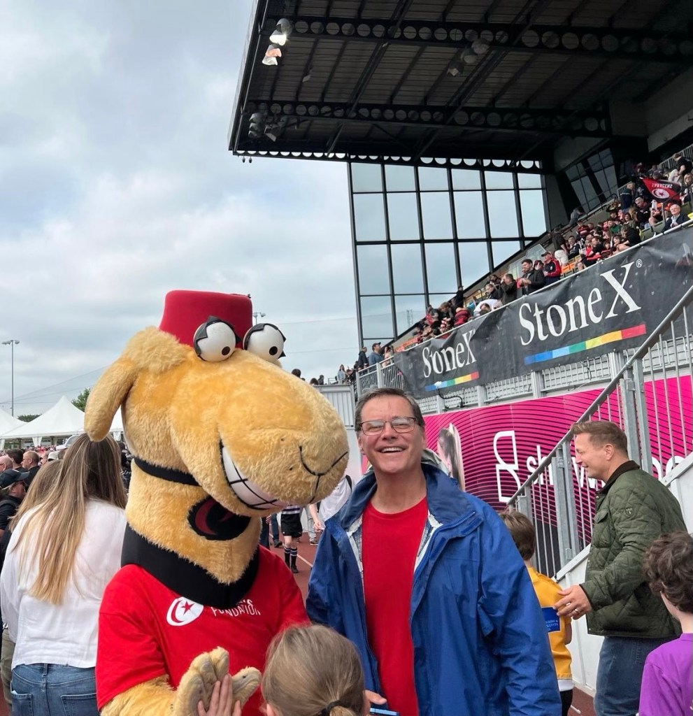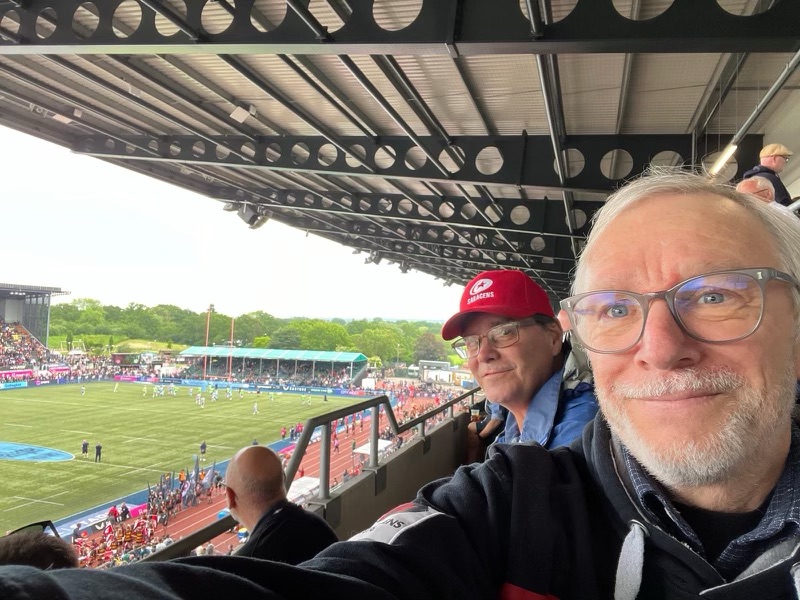On Saturday, Bob left the house about 10:20 am to catch the train to Cambridge to meet up with our friend Peter, who had kindly offered Bob one of his season tickets to watch the Saracens rugby team play against Sale. Bob has been watching and trying to learn about rugby since our first international housesit in New Zealand, but this was his first time to see a proper game — and at the premiership level. He even treated himself to some merch.