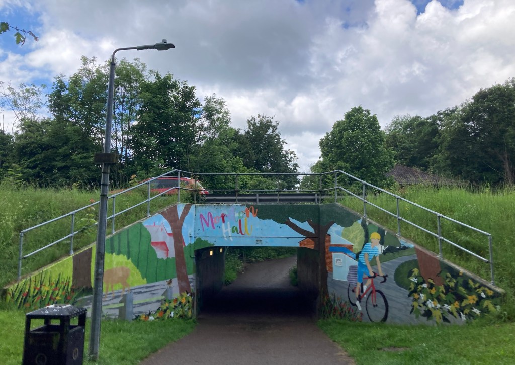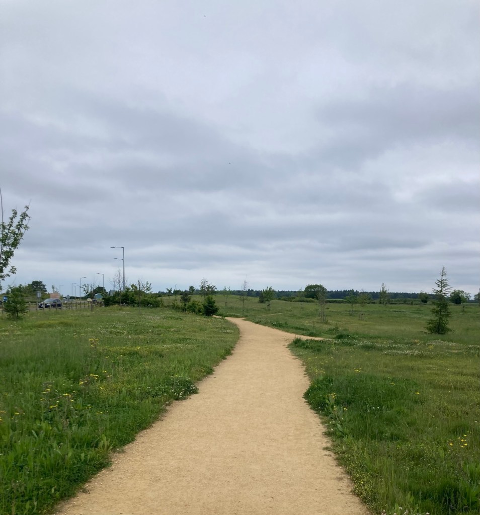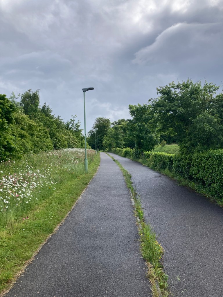 One of the pubs we passed as we headed out of the town centerWe walked on the street along the northeast border of the Abbey Gardens. This is the Abbey bridge.Another pub along the routeTree art on the sidewalk, and you’ll notice the wet street.Wildflowers Look at this awesome path!Another pathEntering the Flying Fortress Park A small sitting area in the parkA playscape in the parkA colorful underpass under a busy road on our walk backA 5k loop using some of the paths we had walkedWe did not see the new zebra. We didn’t see an old one either.😂
