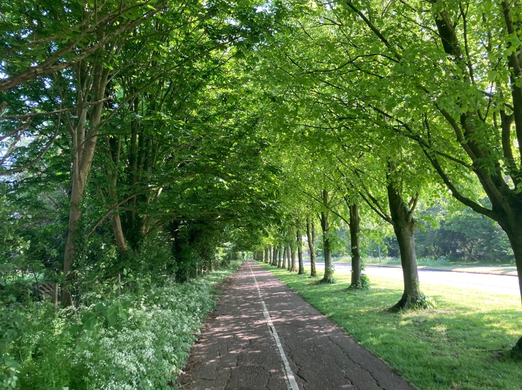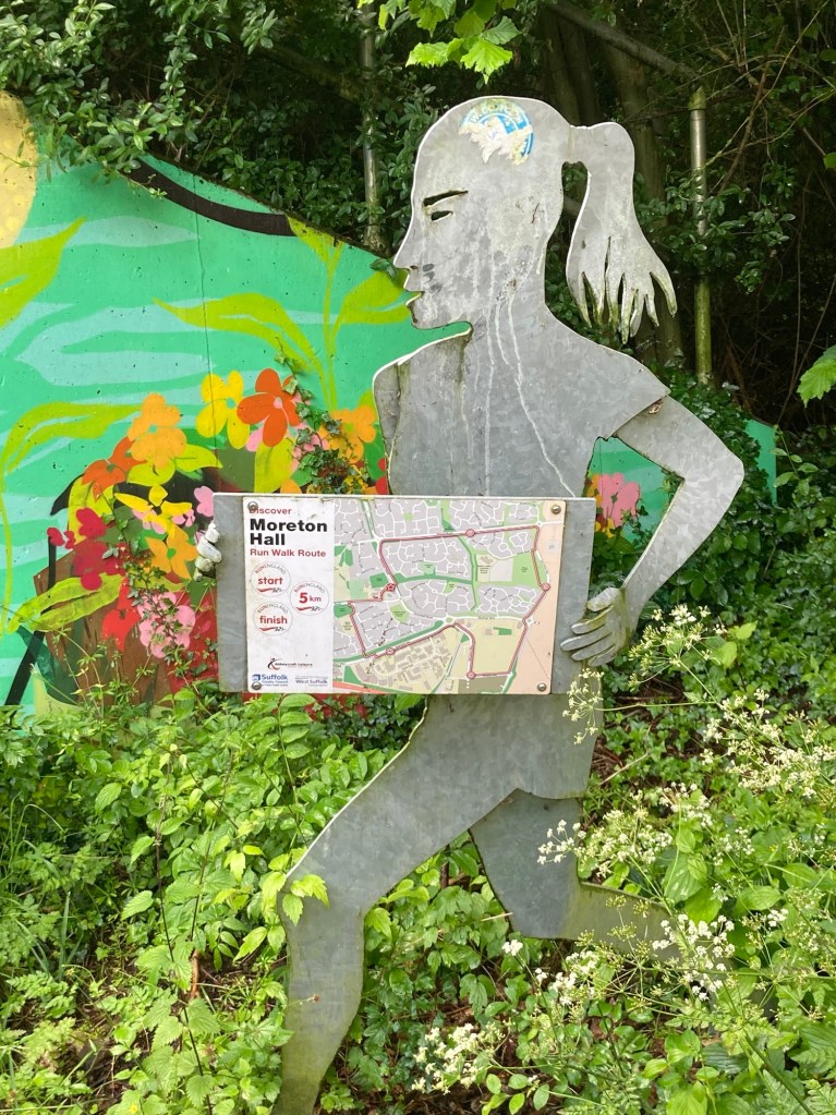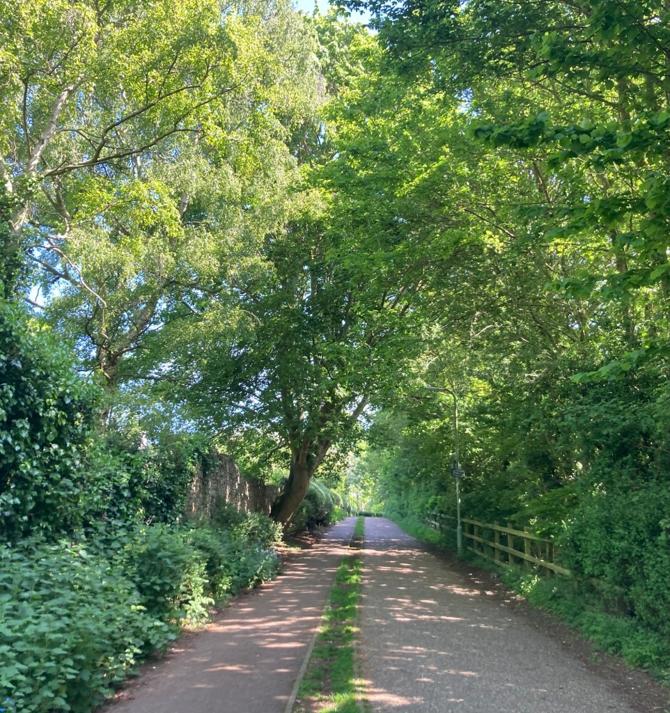 A divided pedestrian and bike path Looking back towards townPeeking through trees along the pathA shaded walkSignage along the wayThe Moreton Hall Tavern on a pond