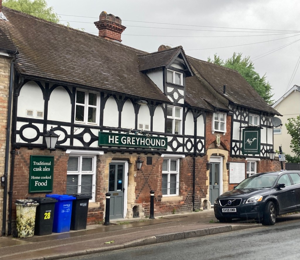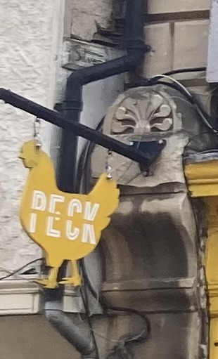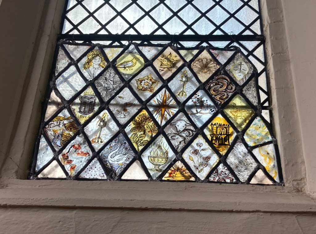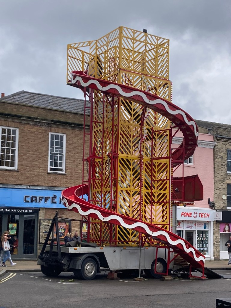 The public libraryA study or event room in the library, which I was told I was not to have taken a photo of without asking permission. Peck Fried Chicken, a local establishment that started as a food truck. Bob is anxious to try it out.A bigger photo of the Peck sign.A Quaker Meeting House on St John’s StreetSt John’s ChurchThe sanctuary of St John’sA stained glass window made by a community art group in 2017 to celebrate the church’s 175th anniversary One of many pubs owned by the Bury-based Greene King Brewery A carnival ride at the marketMollie and Angus playing with a ball in the backyard