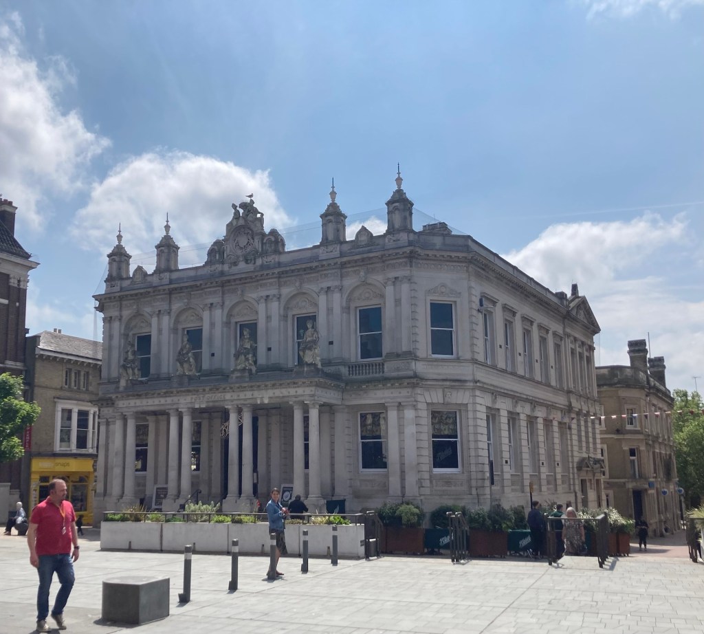A pedestrian only streetIpswich Town Hall, announcing the celebration of the 550th anniversary of the birth of Thomas WolseyAn impressive post office building, now housing The Botanist bar