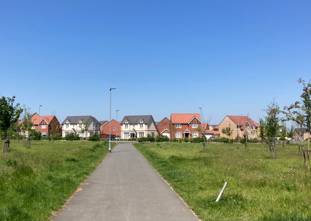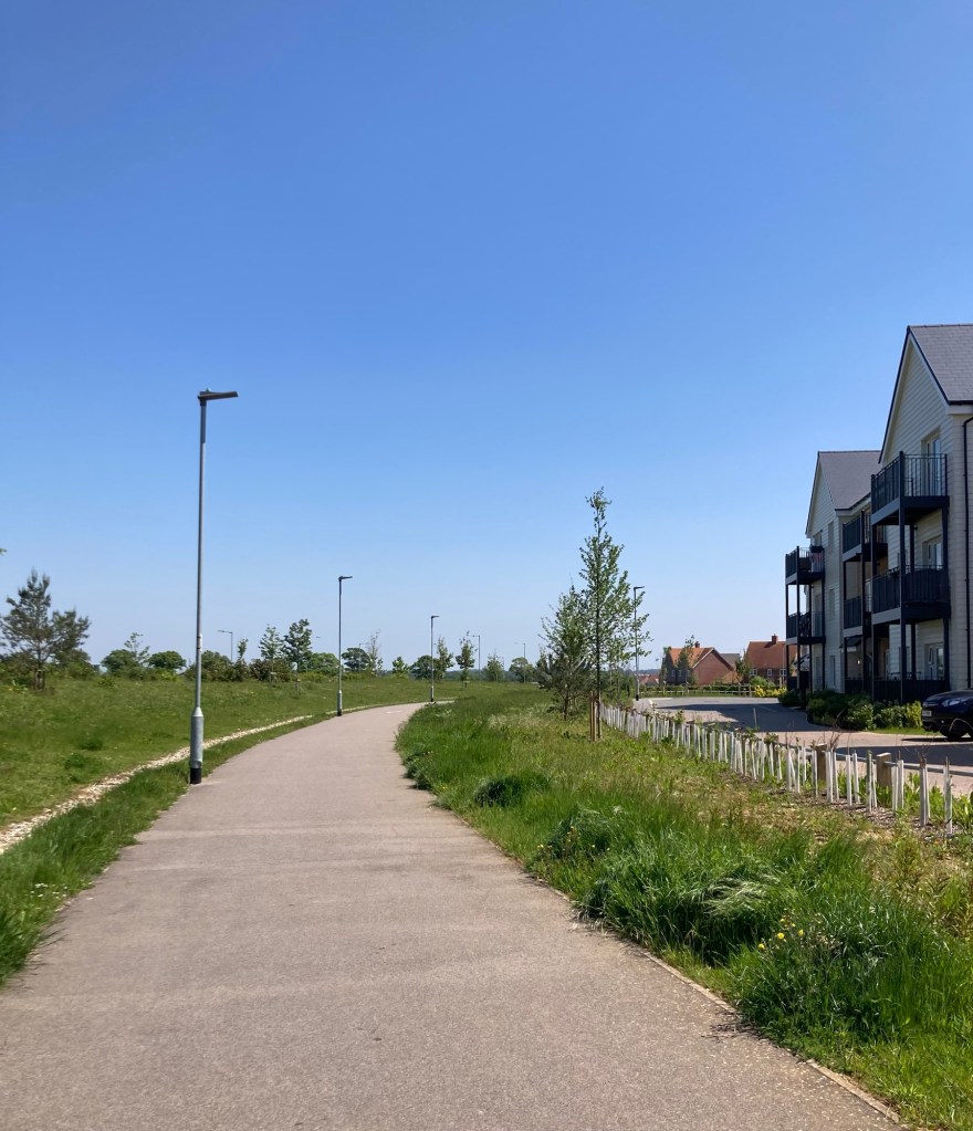 A path through an established neighborhood Walking towards Marham ParkWalking the narrow trail behind Marham Park, where homes are still being builtWalking on the wide hike and bike trail around Marham Park The entrance into the neighborhood from the main road