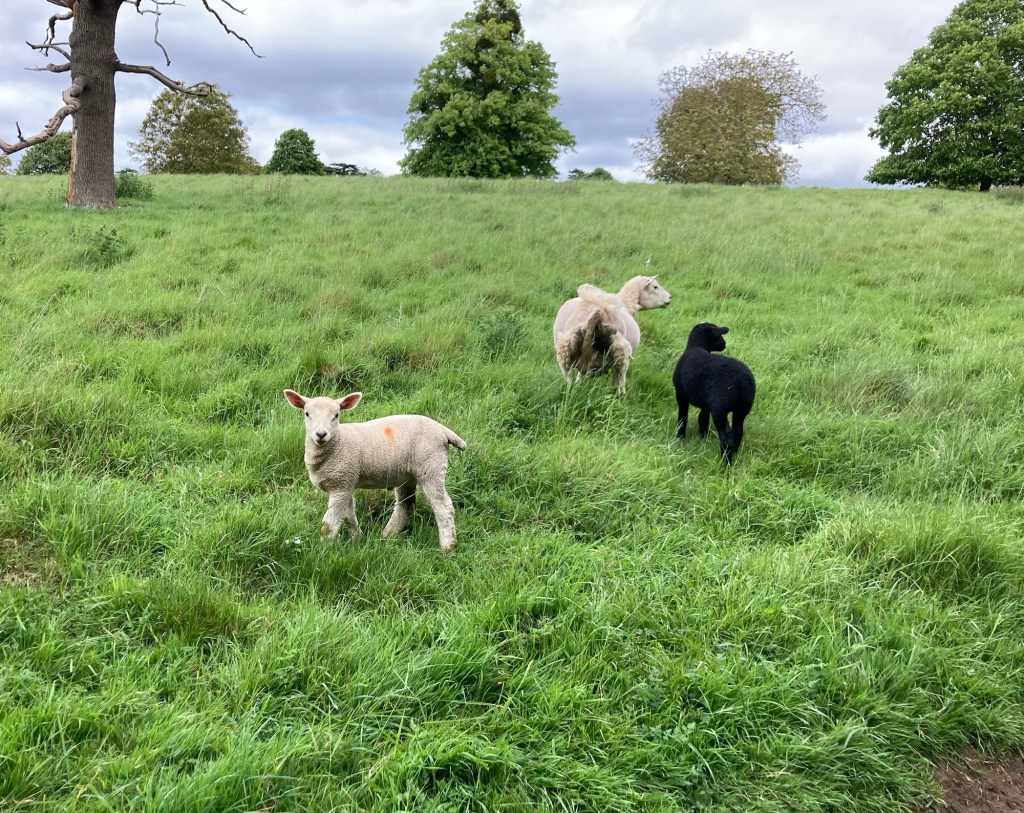 An 1861 cookbook in the servant’s kitchenPart of the Italianate GardensWalking through the Stumpery, an artistic display of tree stumpsBob and the dragon stumpAnother decorative stumpSue captured Peter, Bob, and I in front of the rotundaThe chapel on the groundsLooking across the lake towards the walled gardenSome of the many sheep on the property