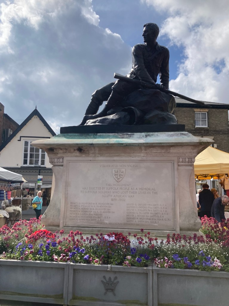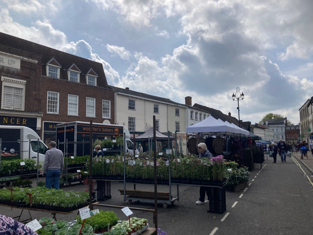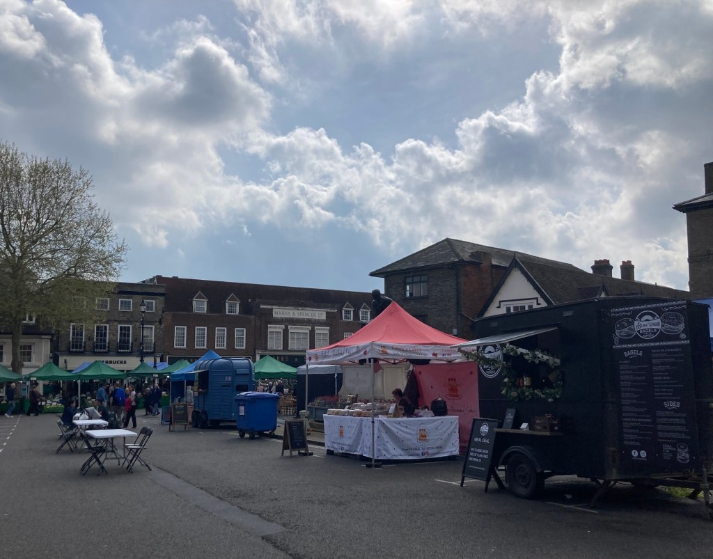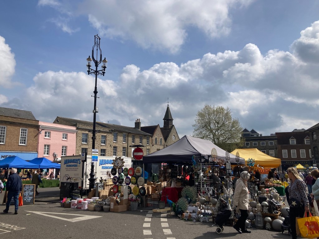 Today we did our easy walk down to the city center to explore Bury’s market that occurs every Wednesday and Saturday. The website said there are about 60 stalls on Wednesdays and 80 on Saturdays. The market dates back to before the days of William the Conqueror (died 1087). We perused the stalls and found a couple items to purchase at a baker’s stall. We also stopped in an M&S to do a grocery run.