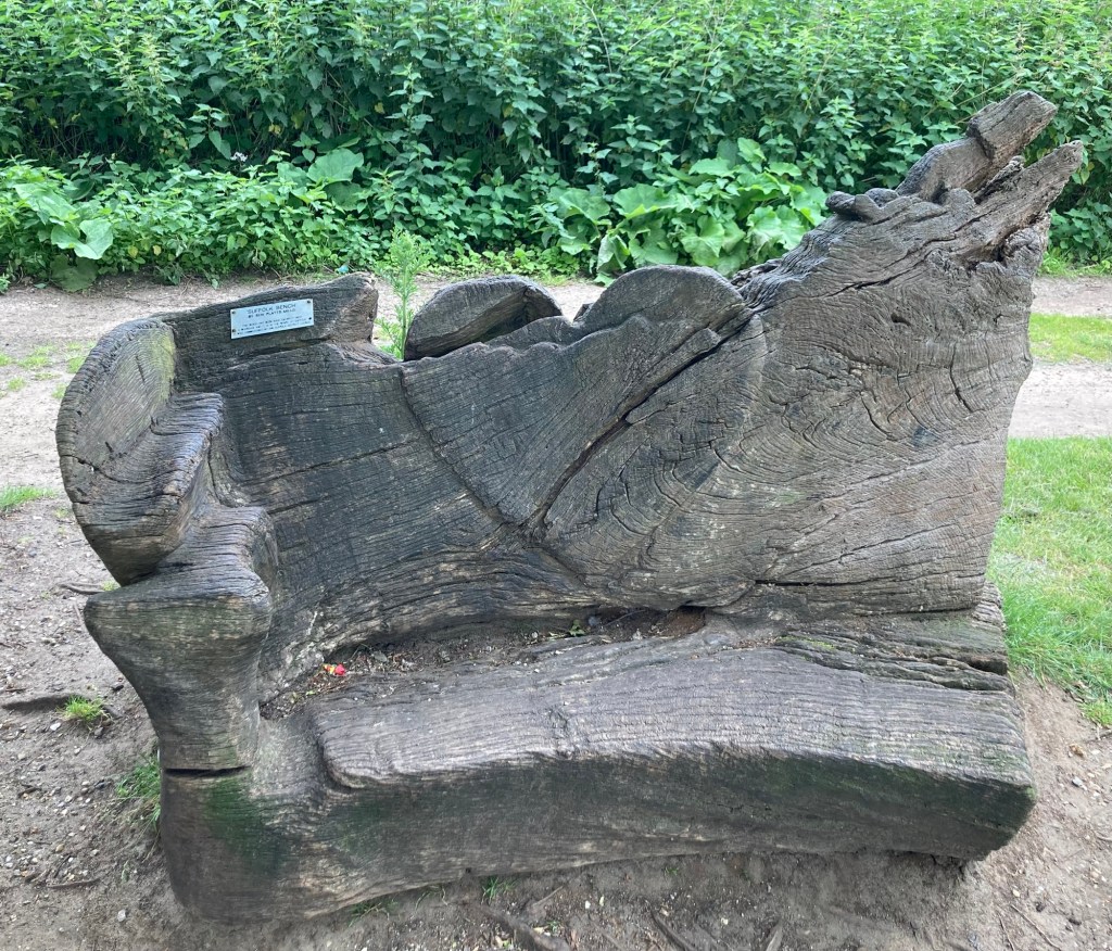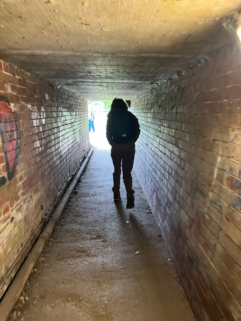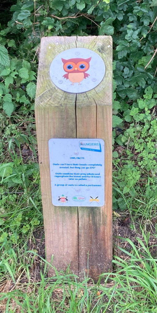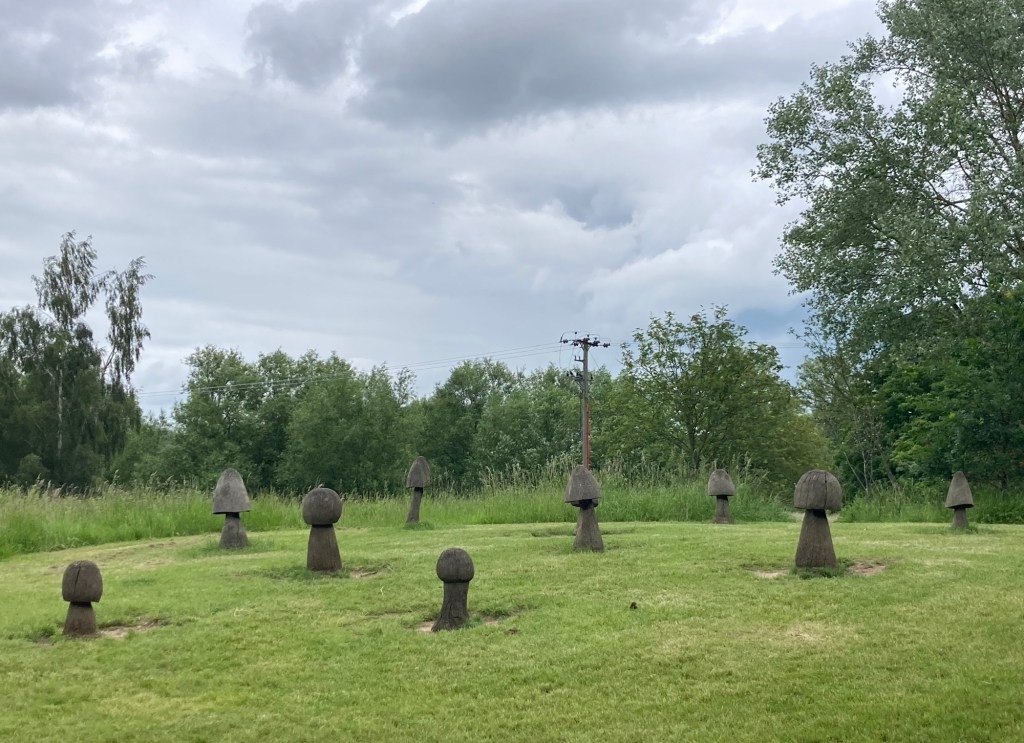 Needham Market Train Station Crossing under the rail line to the Needham Lake Nature Trail via a low-ceilinged cattle tunnel.Even I had to stoop going through the tunnelOne of the many informational posts about animals along the trailNeedham Lake, where tomorrow they will hold a circus-themed homemade raft raceA chainsawed bench by Ben Platts-Mills in the shape of SuffolkSignage for a longer trail that runs alongside the lake trail for a bit on its way from Oxford to FelixstoweDucks in the lakeA carved wood statue of mother and childThe Visitors Center (with a cafe of course) and playground Walking the path along the River Gipping near Needham LakeThe River GippingWe never seem to be far from sheepCarved wood mushrooms along the lake trail