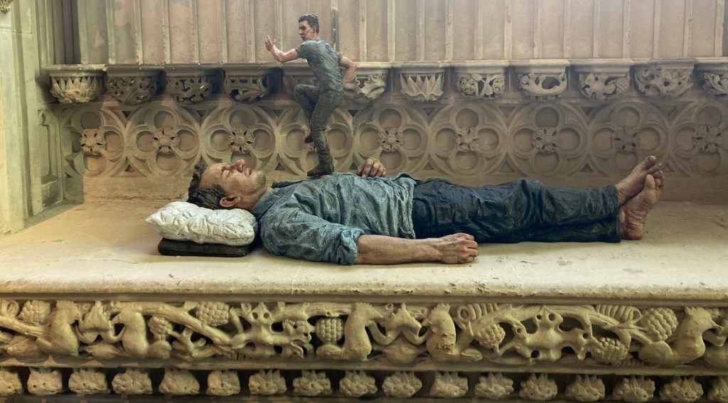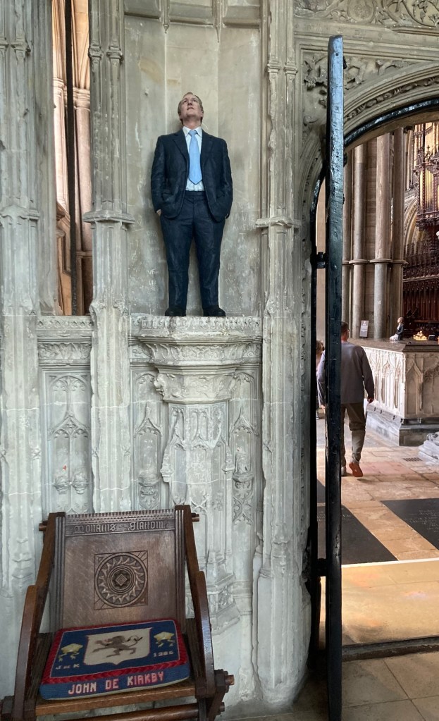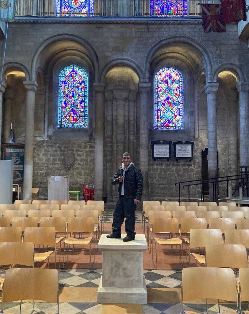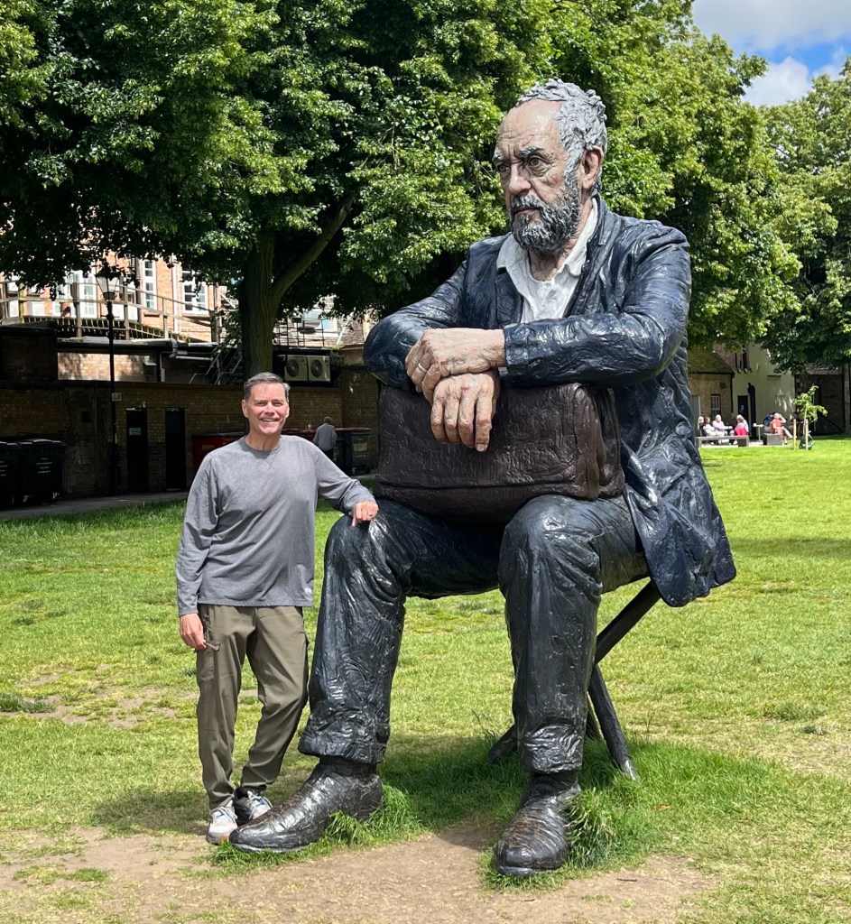 The 4 amigos, Sue, me, Peter, and BobA statue of Garfield cat, known for frequenting the nearby Sainsbury’s, and his bench in a pretty Ely parkThe River OuseOne of the rooms in the cute Peacock Teahouse where we had a lovely lunchEly Cathedral, which began as a monastery in 673. It was closed by Henry VIII in 1540.The cathedral made a great location for the sculptural art exhibit by Sean Henry. The appropriately named Standing Man and Standing Woman.Bob and Seated Figure in the cathedral lawnA view down the Norman nave of the cathedral Looking up to the top of the West TowerqThe octagon, which separates the nave from the choirStanding Man in the north transeptThe pulpitThe tomb of George Basevi, a well known architect whose most important public work is the Fitzwilliam Museum in Cambridge. He fell to his death when inspecting the West Tower of the cathedral.Lying ManMan Looking UpHeddaSleeperA local bookstore Inside the great bookstore