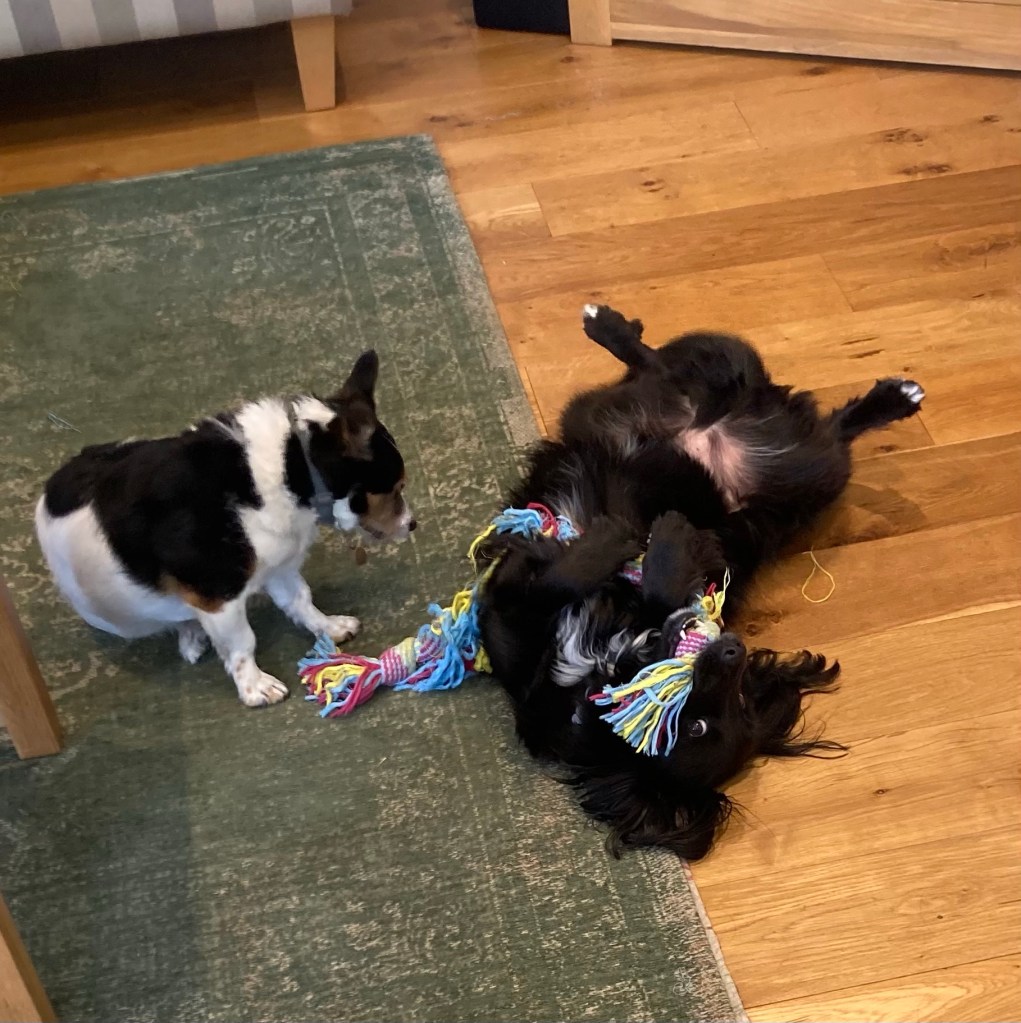 Mollie and Angus just back from their morning walk Mollie fiddling aggressively with the pillow until it’s just right to lay onMollie and Angus playing with their toy. This was Angus’ way of crying uncle.