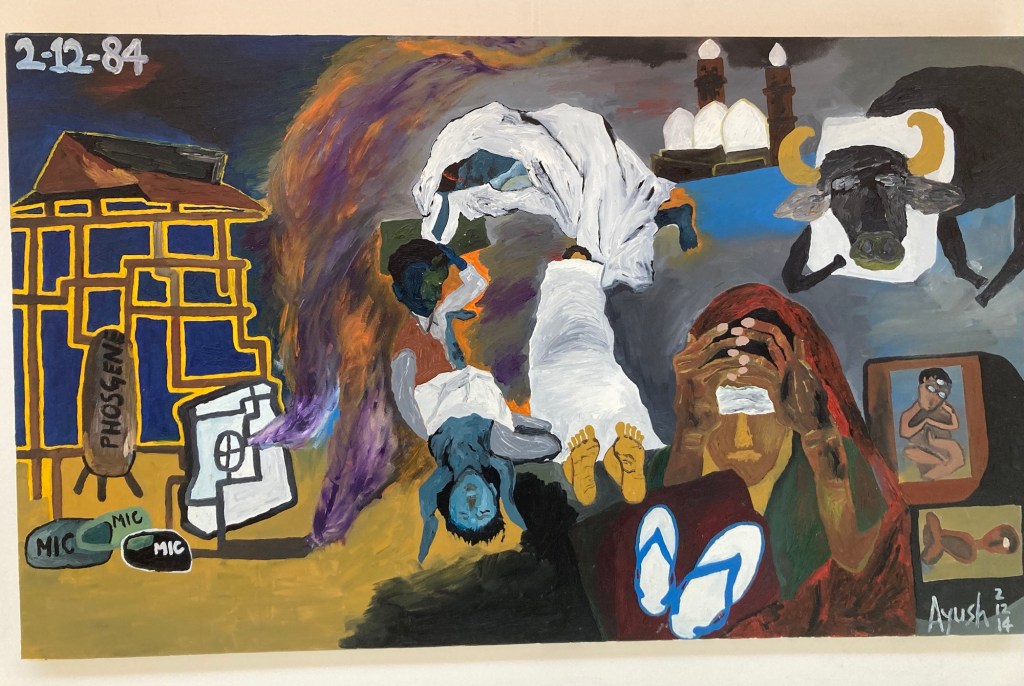 A painting of the Bhopal Gas Tragedy in December 1984 by Ayush Sinha. One of the paintings on display at The Apex.Looking down on the theater entrance and ticket counter from the upper level.View of the outside plaza from the upper levelOne of the bars on the upper level of The Apex