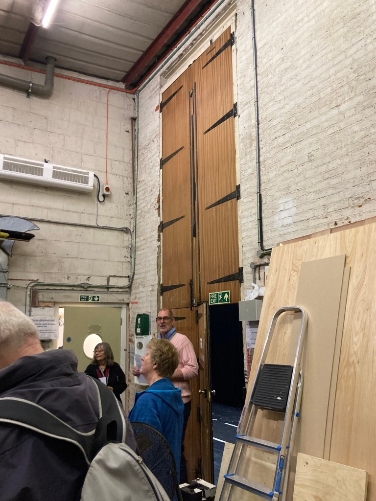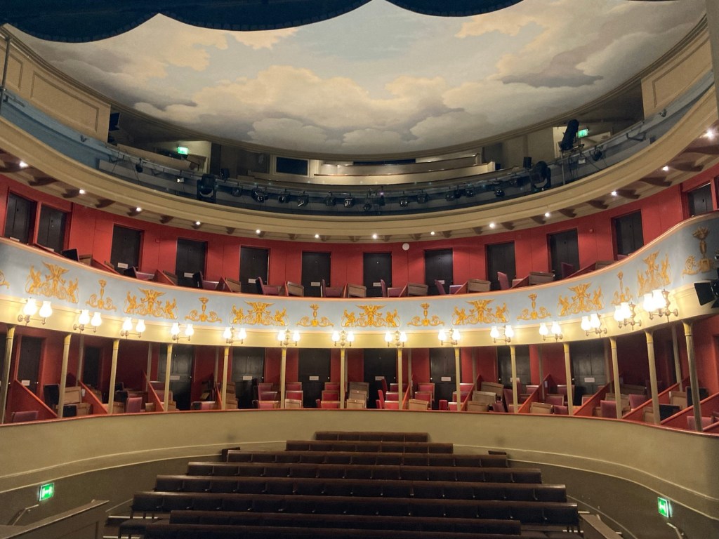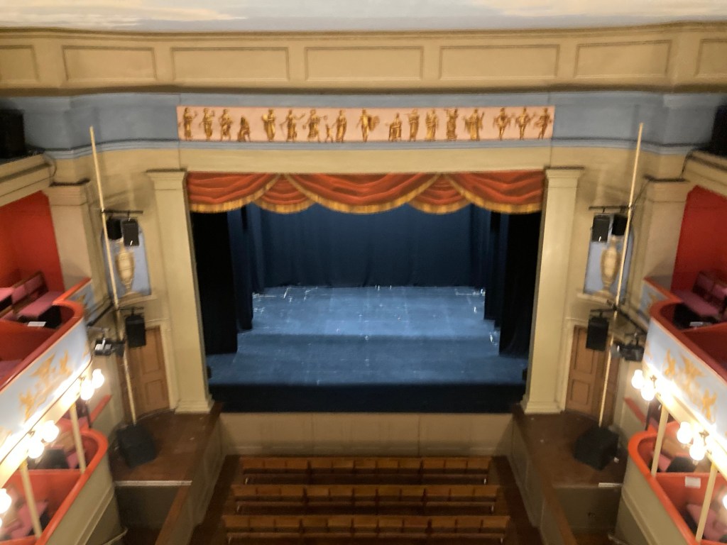 Bob and I were back at the Theatre Royal today for a 90 minute tour of the facility. The theater was originally built in 1819 by the architect William Wilkins as the New Theatre and was structured on the design of an amphitheater he had seen at Taormina in Sicily. A new theater was needed to expand the capacity for theatergoers in Bury St Edmunds, and increased such capacity from 350 to 780. (Ironically today, with the addition of more modern seating in accordance with safety requirements, the capacity is back down to about 350 again.). The first play staged in the theater was the British comedy ‘John Bull.’