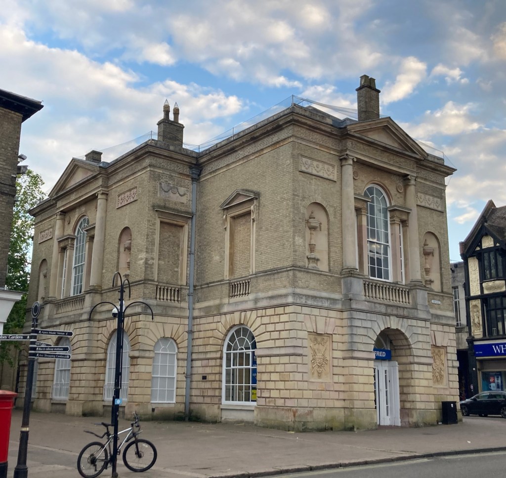 It turns out that a market cross actually began as a wooden and then stone cross, often attached to stone steps, at the highest point in a market area, where people could meet to trade but also pronouncements could be made or posted. This evolved into more sheltered structures to protect from the weather, and then these structures became more official buildings that might house other municipal type offices or space for artisans and even a place for touring actors groups to perform. Bury St Edmunds Market Cross had a similar evolution and was used as a theater until a bigger space was needed and the Theatre Royal was built. It hasn’t been used as the main center of trading for a long time and most recently served as an art gallery and then a space for creatives to work. Sadly today, the upper floors are empty and the ground floor houses a betting establishment.