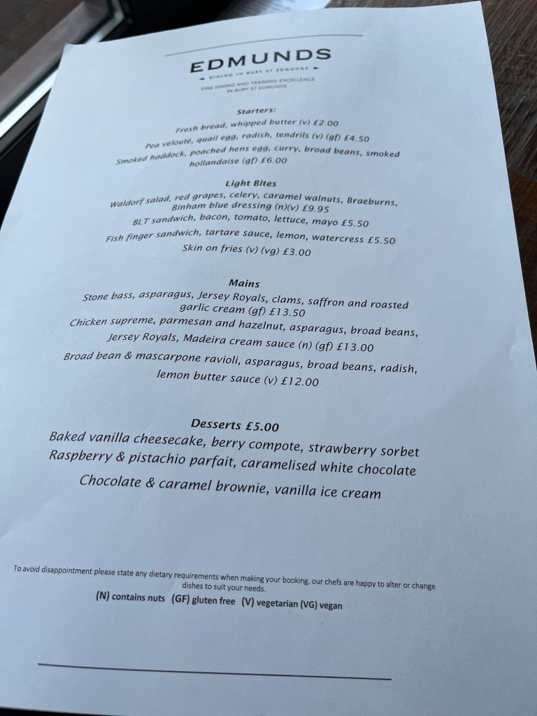 Up the street from us and just around the corner is the West Suffolk Sixth Form College (similar to a junior college), where Bob read that they had a cooking program and a related restaurant, Edmunds, open to the public. Reservations are required while the restaurant is open during the school term, and by the time we learned about the restaurant, there were only reservations available for the lunch service. So today, we had a lovely long lunch while we helped to train some future culinary superstars.