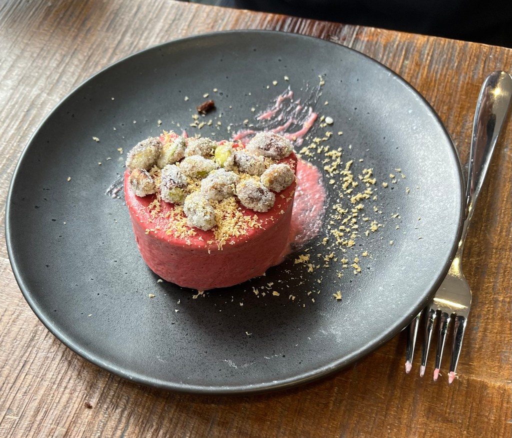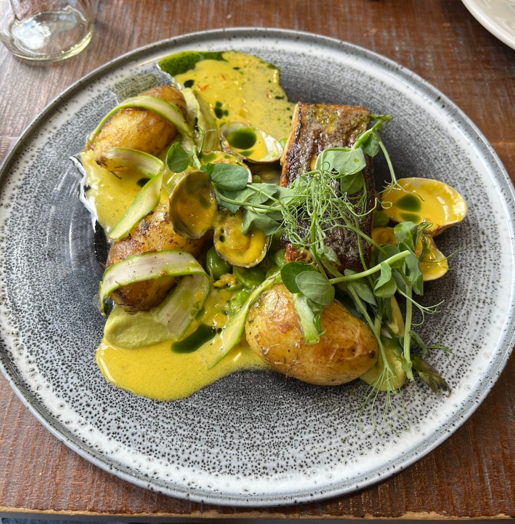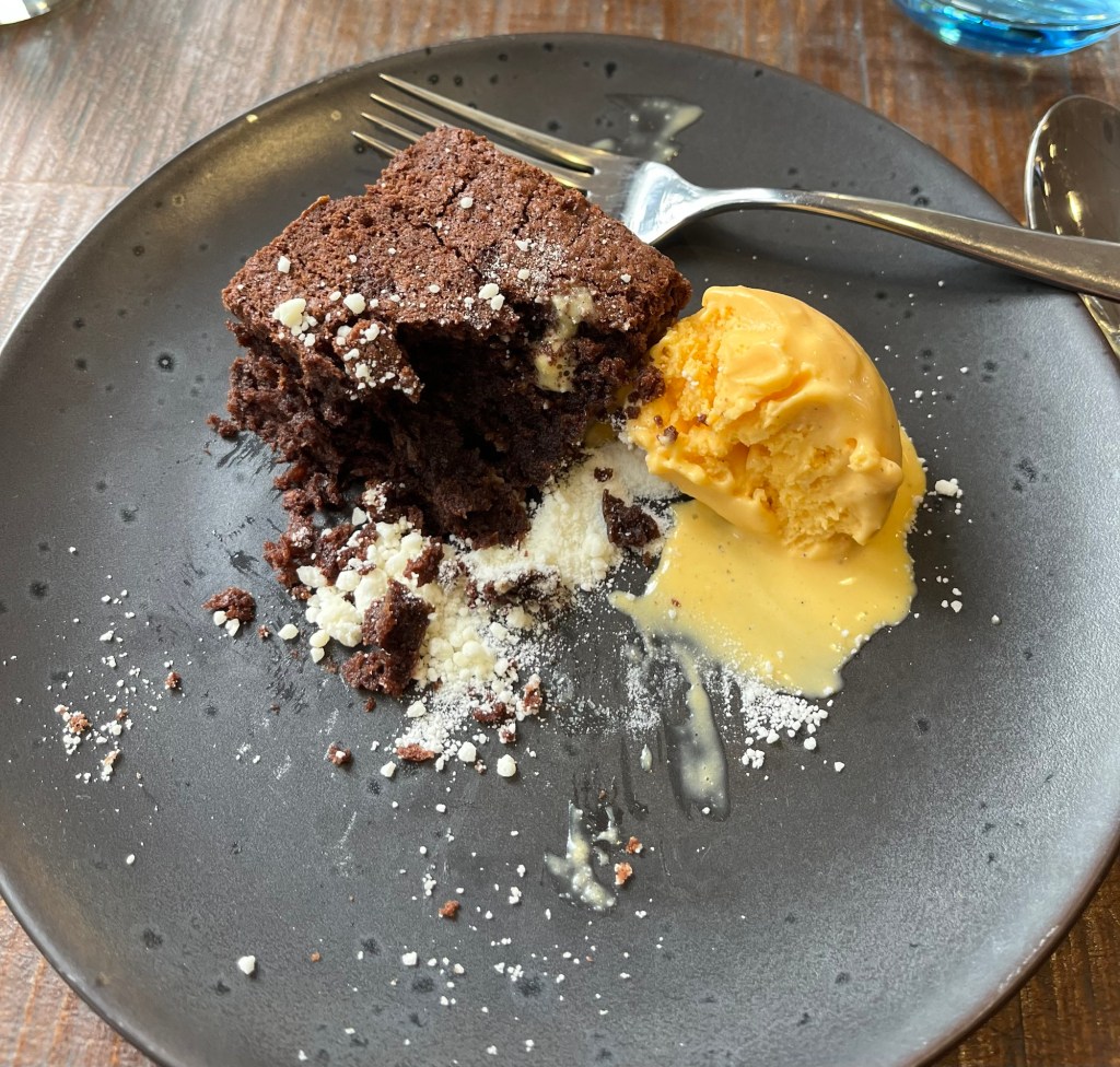 The Suffolk Regiment Museum at the end of our street and adjacent to the schoolApproaching the restaurant, which is accessed only from the car park and not from the front of the school building The view from the window near our tableThe interior of the restaurant Today’s menuWe both got the pea velouté appetizer. Very good!Bob’s bass main course My broad bean ravioli Bob’s brownie and some kind of ice cream. The menu said vanilla. The server made a point of coming back to say it wasn’t served with vanilla, but we didn’t understand (and couldn’t tell) the new flavor.My strawberry and pistachio parfait.