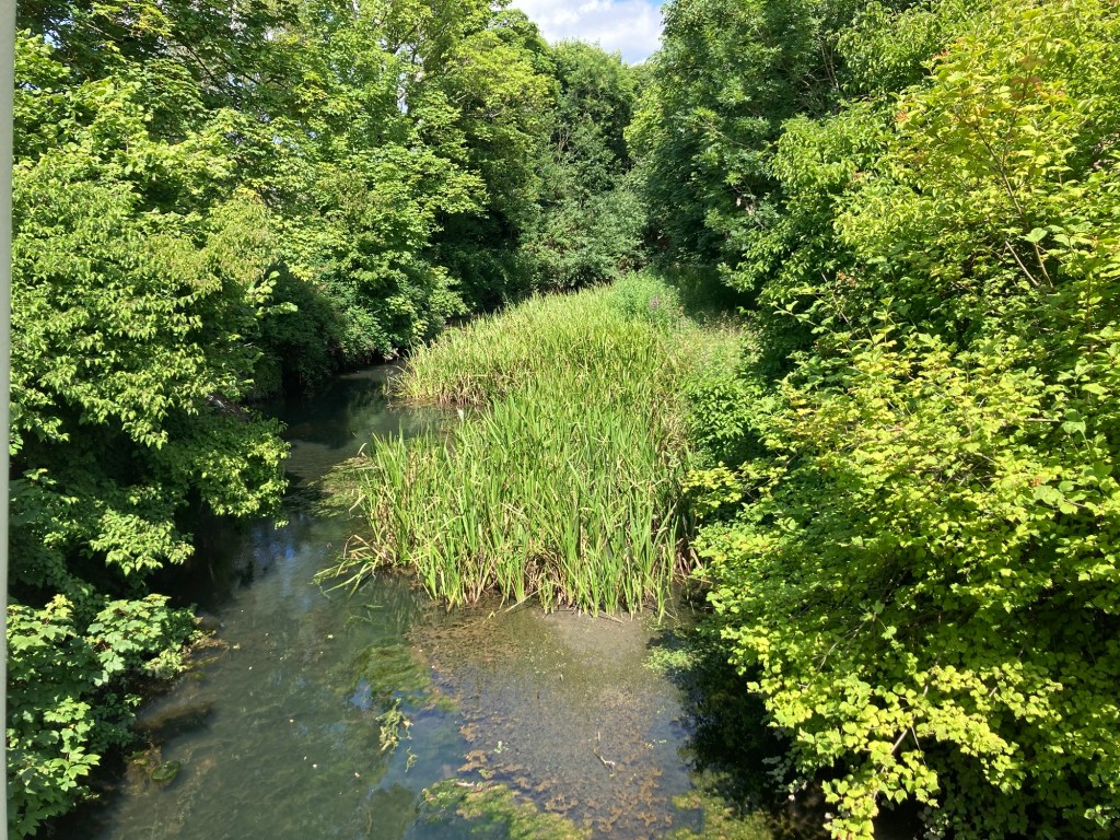 Our first view of Stowmarket as we crossed the raised walkway at the train station The start of our walk along the GippingLooking back at one of the bridges we walked under along the pathThe narrow path behind an old mill in townAnother bridge over the RiverThe narrowing path as we left the town centerA close-up of some pretty purple flowers along the pathMore purple Lots of green growth in the very shallow (at least this part) River