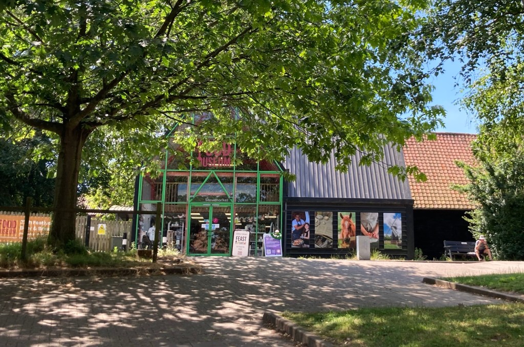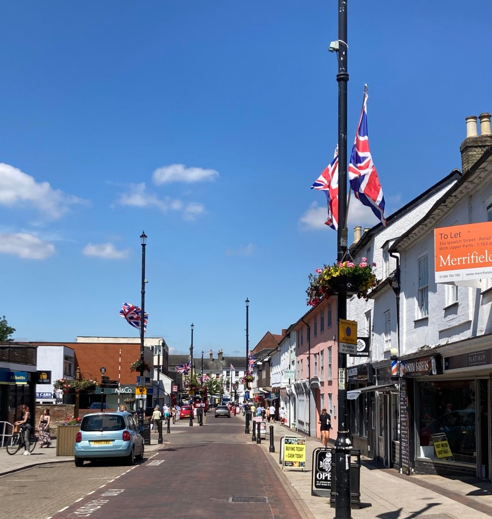 The bridge over the River Gipping that we crossed to go into the town centerThe church of St Peter and St Mary, which dates to the 14th century. We popped inside and much of the nave is now given over to a cafe.Walking towards the high street from the church The main intersection on the high streetLooking down the high streetOne of the local pubsThe Regal Cinema, which hosts live performances and filmsThe cafe and gift shop for the Food Museum. We didn’t spend the 15 pounds each on the museum, but the shop was super cute and they were holding a screen printing class.Part of today’s market stalls