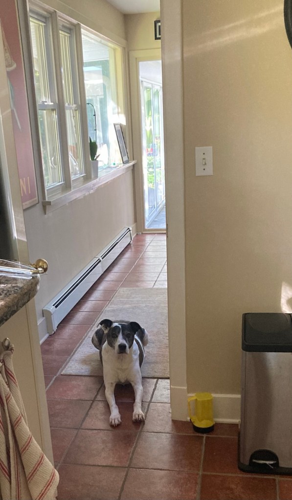 This is leisurely mode.This is “I’m up for either a meal or a treat” mode, as he is looking into the room where he’s fed while lying next to the counter with his treats.
