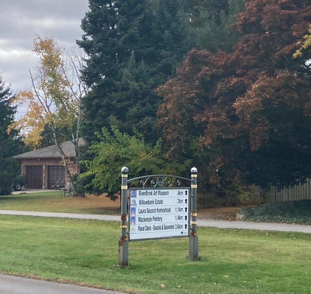 The Riverbrink Art Museum that we will try to visit another day.Looking up the trail as we walked away from the museum Jack in the gorgeous leaves The houses and lawns along the walk were impressive Signs for tourist sites in the areaA war memorial across from the museum