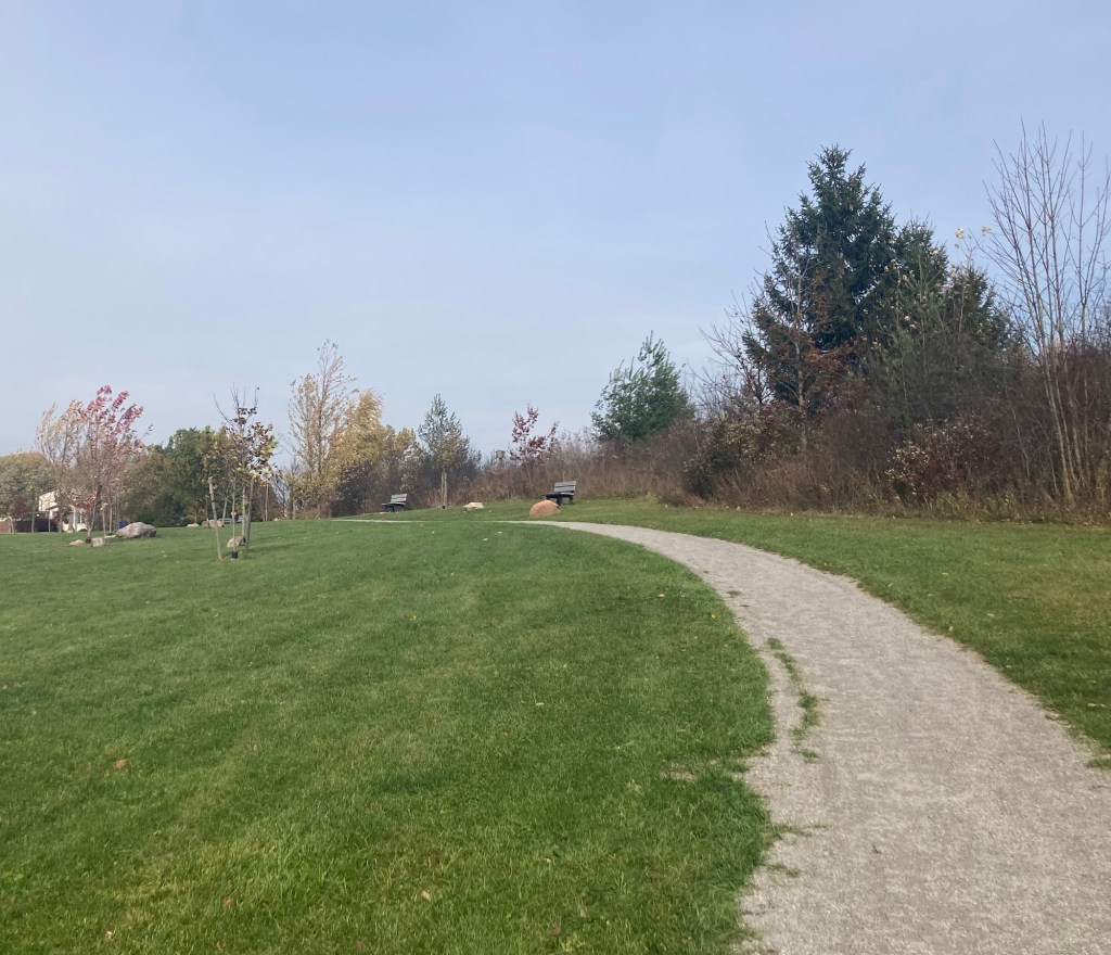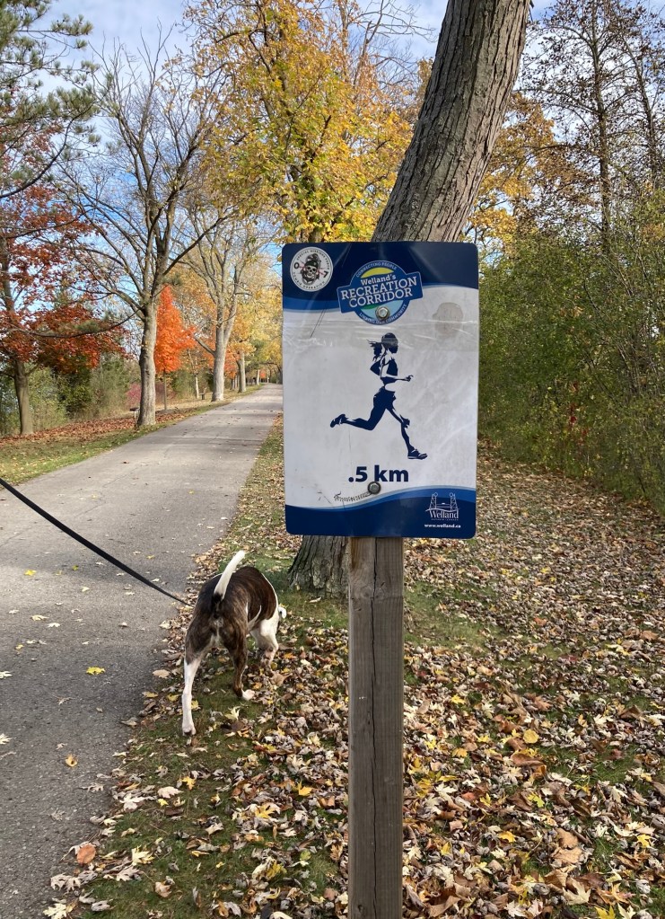 A Welcome to the First Nations Peace Monument at the entrance to the parkFirst views of Lake MoodieBob and Jack on the leaf-strewn trailLooking across Lake Moodie toward Brock University The trail follows an embankment around the lakeLooking across the embankment A bridgePretty flora near the waterWater time!