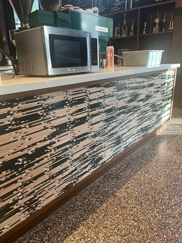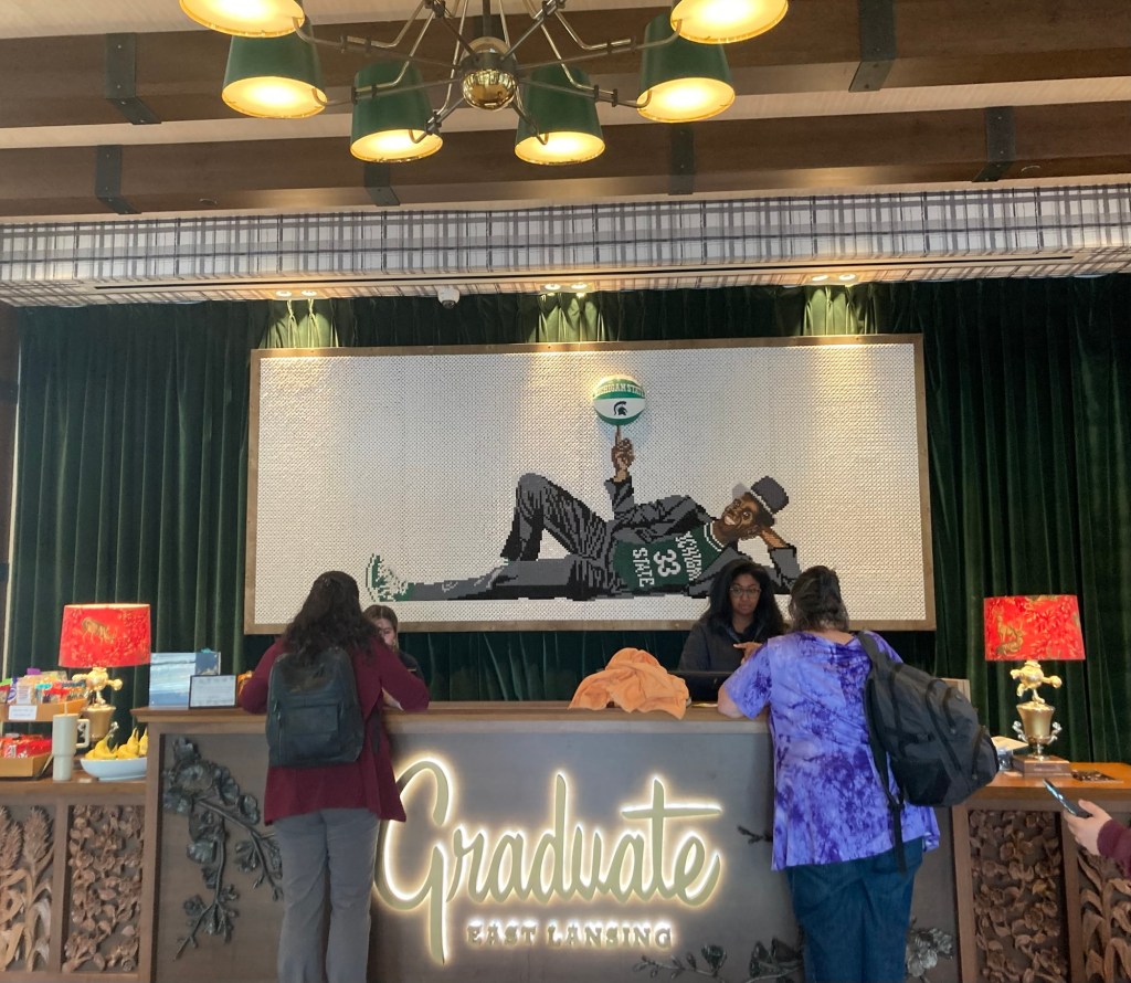 MSU grad, Magic Johnson greets you as you enterThe pencil packed coffee bar in the lobbyOne end of the Graduate Rock Bar on the 10th floorViews of the neighborhood and the football stadium in the distanceAnother view from the Rock BarLooking across the bar. While MSU students and athletes are now the Spartans, they were the Aggies when the school was first founded as an agricultural school.