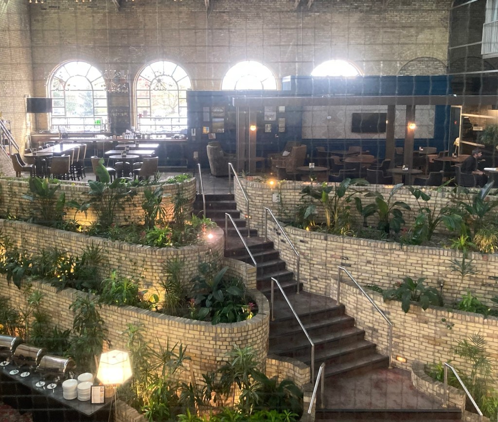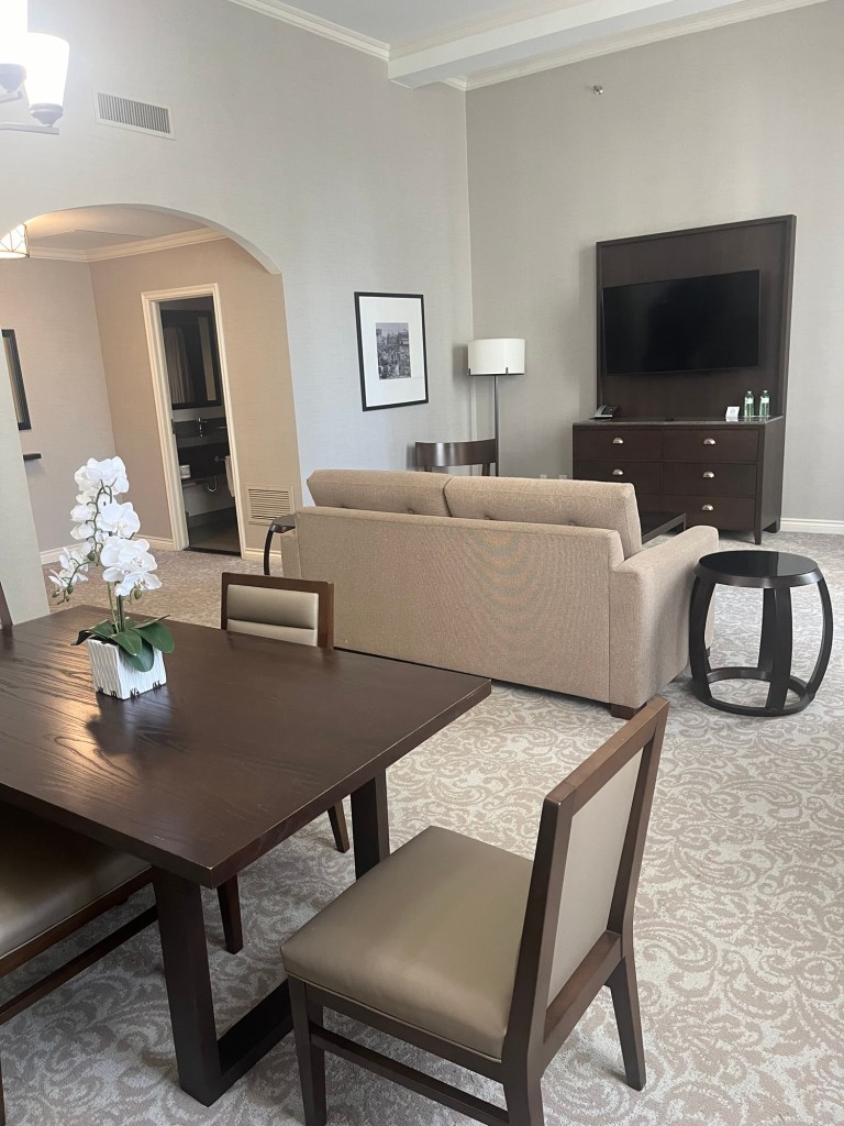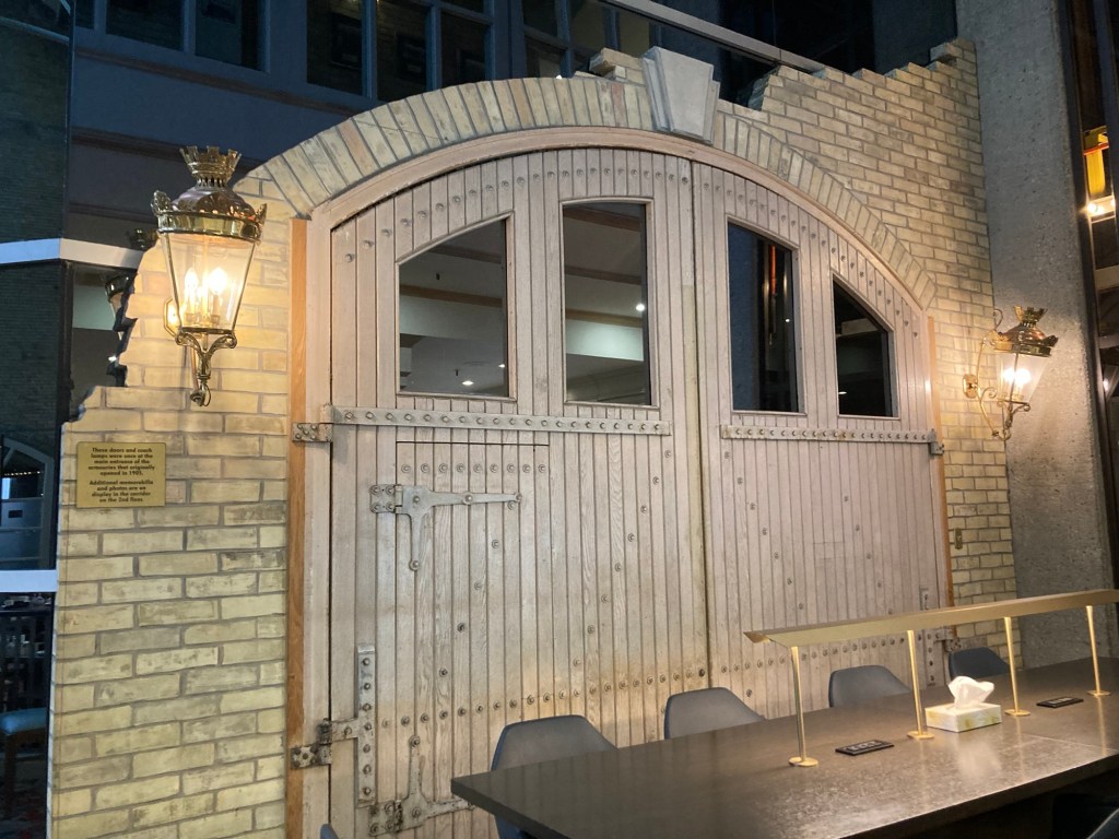 The kitchen, dining room, living room , and second bathroom of our suite.Looking down on the armory turrets from the lounge on the 20th floor.Views from the loungeDowntown London Steps inside the old turretsDoors and coach lamps in the lobby restaurant that were once the main entry to the armory The lobby bar above the restaurant Part of the memorabilia on display on the 2nd level of the hotel