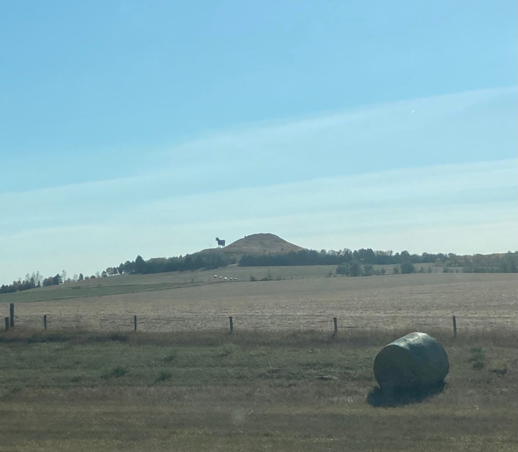 That is a large fake cow a ways from the road. We also noticed that in North Dakota, the hay/grass in the road easement is baled.