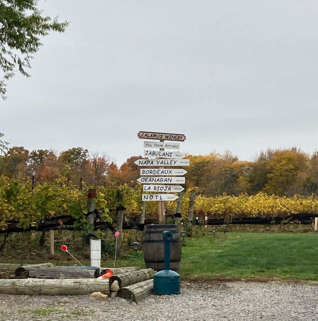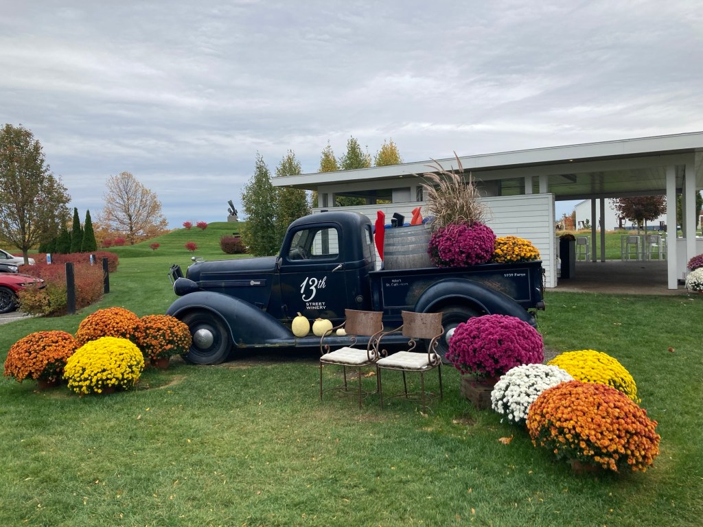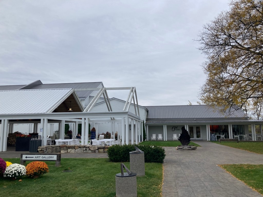 The fall decorated signSome of the grounds and artThe bakery and storeThe winery and patio
