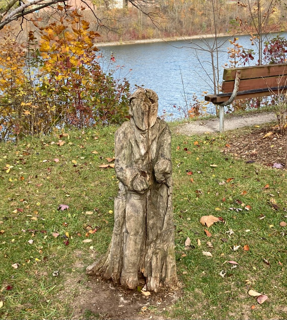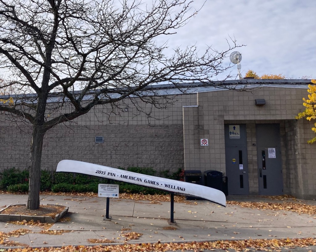 Canoe art by the restrooms in the parking lot where we started the walkIn 2017, in commemoration of the 150th anniversary of Canada, the city of Welland planted 150 trees, many of which were given in memory of one or more people.More fall-colored trees, looking towards one side of the island Looking towards the other sideA high school rowing group reminded us of our current homeowner, a member of the Canadian rowing team at the 1968 Mexico City Olympics.Tree art along the trailThe nicely paved trailDistance markersLooking down the canal towards the drawbridge in townThe leaf-filled canal by the shoreLooking across towards another trailheadDriving off the island towards the drawbridge