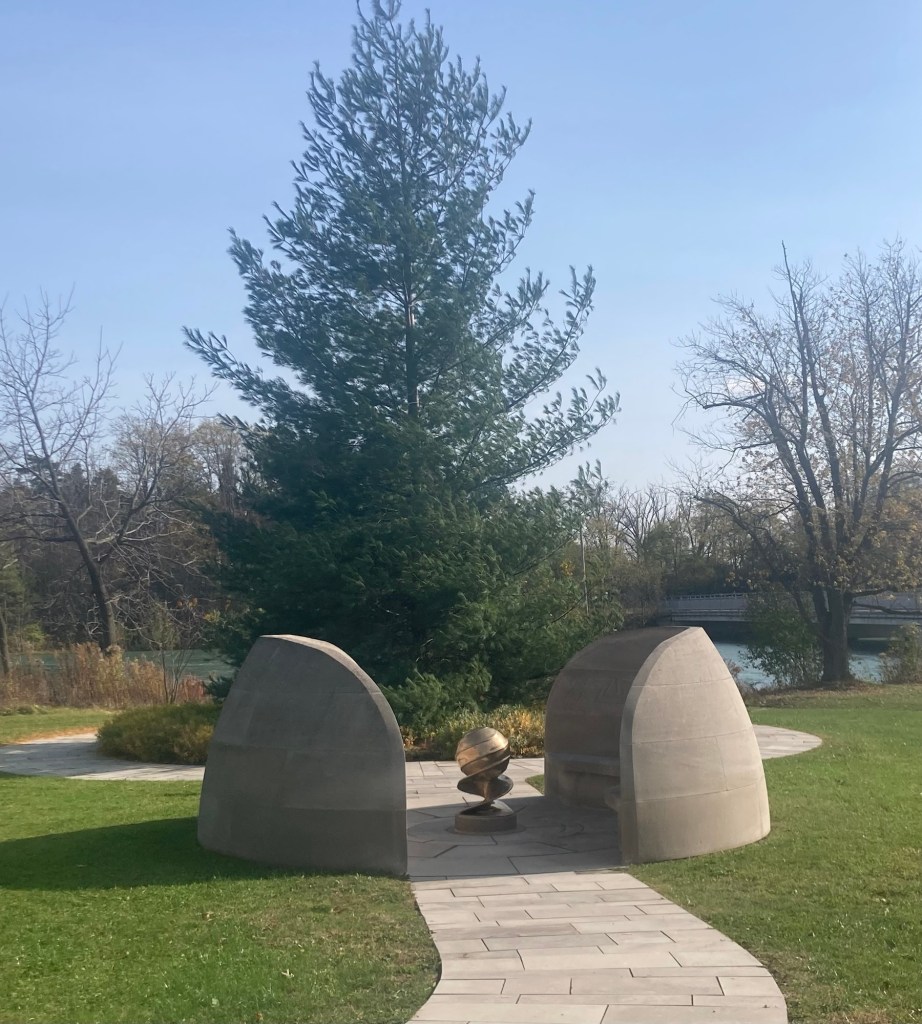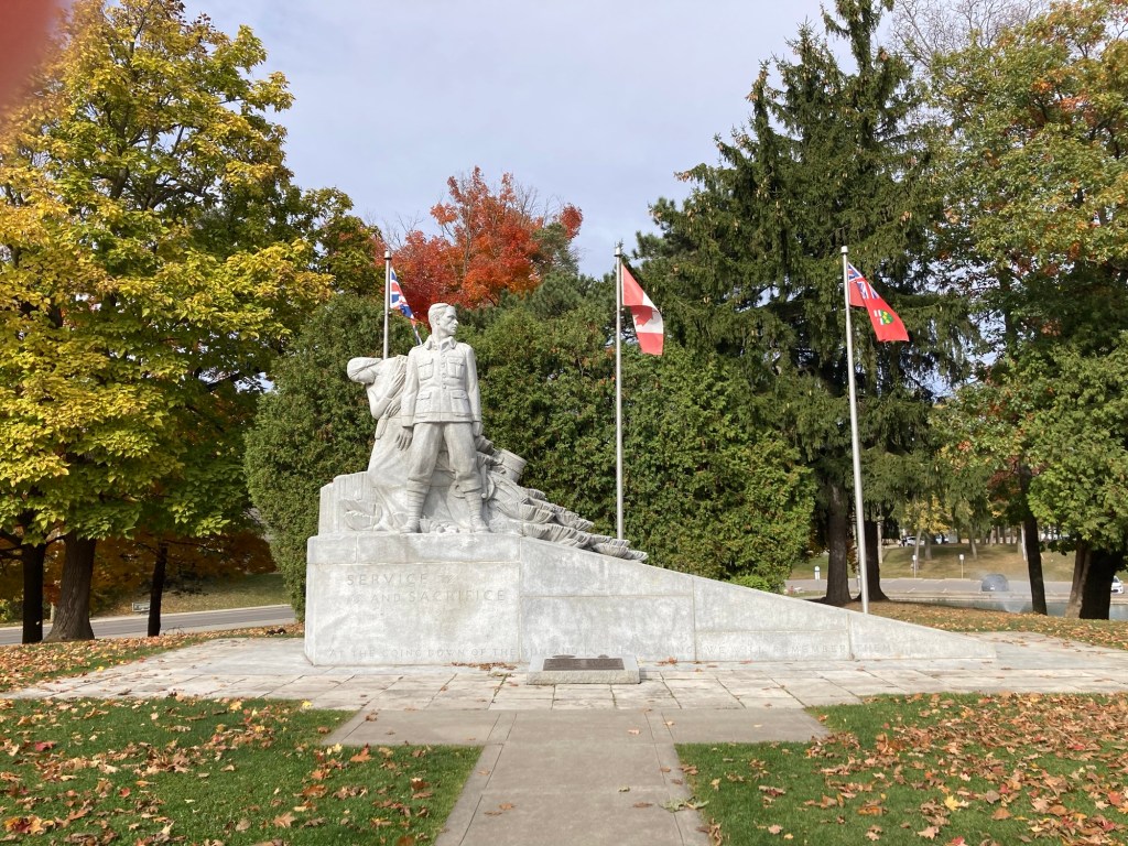 The flower gardenThis memorial overlooks the garden and is given in memory of Allan Leon, Founder of Leon’s Furniture.View one of a war memorial View 2The picturesque pond
