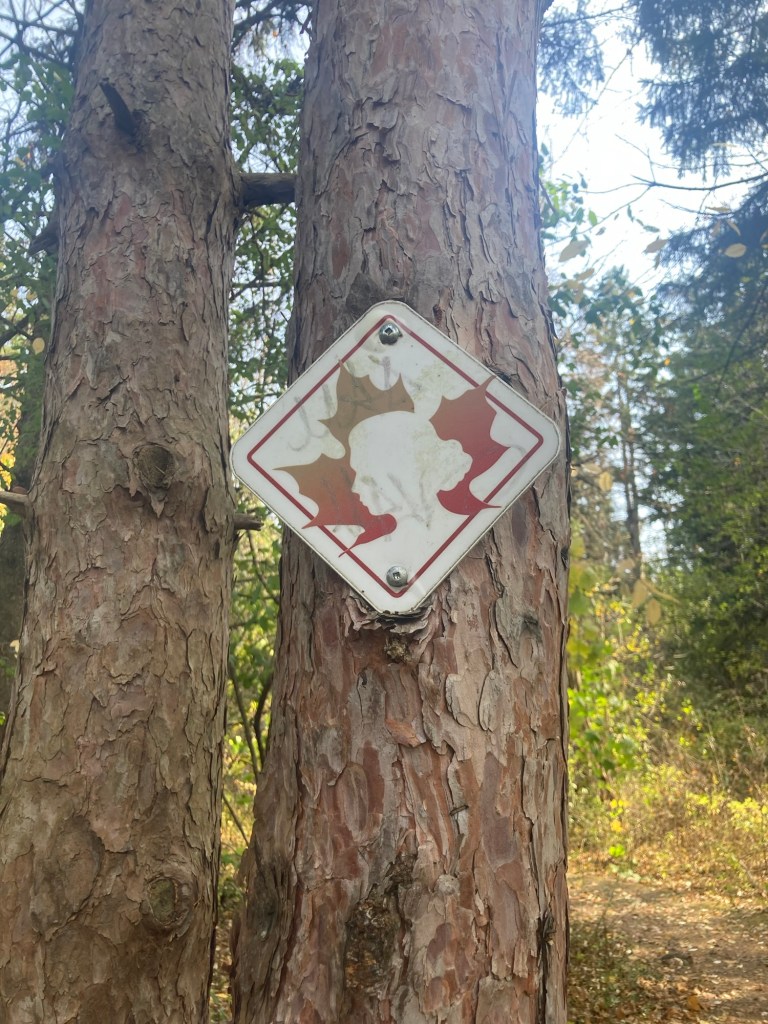 The Bruce Trail, which has a different marker, runs concurrently with the Laura Secord Trail
