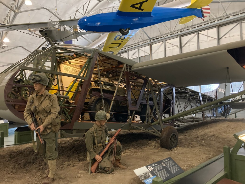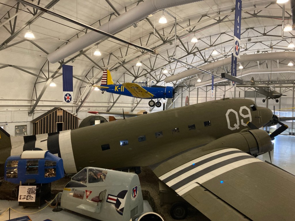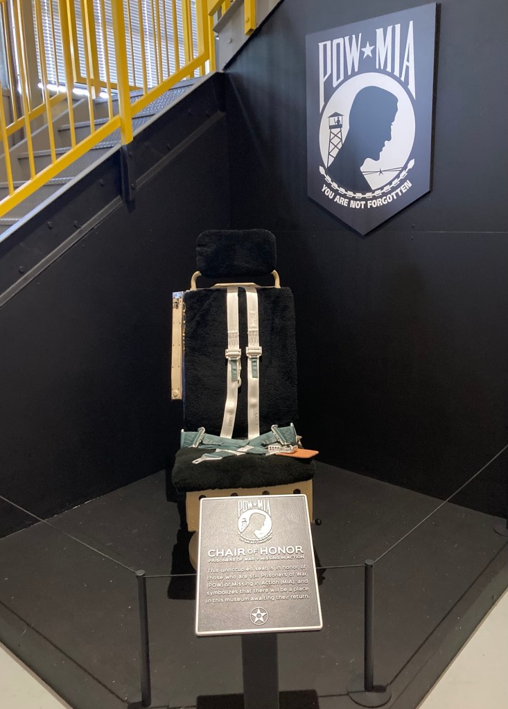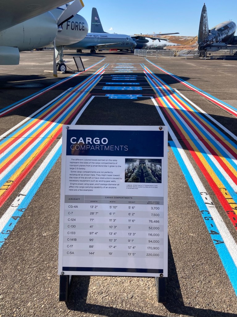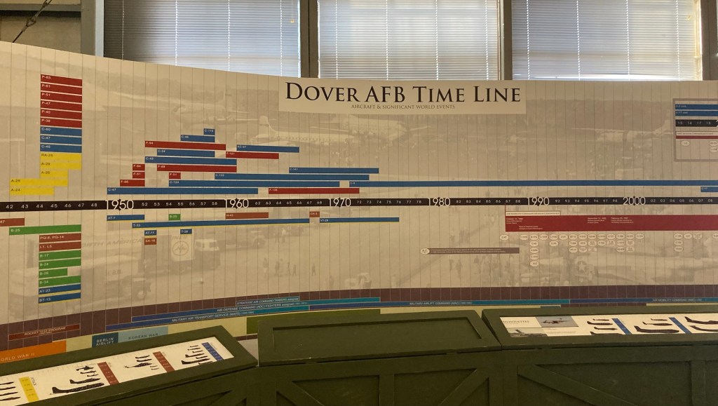 One of a number of photos from the Medal of Honor corridorOne view of some of the exhibits in the hangar portion of the museum A tribute to prisoners of war and those missing in actionSadly, this is how I am most familiar with Dover Air Force BaseA flying boom, developed by Boeing, as an improvement over the former hose method of midair refueling An exhibit of a ball gun turret. Dear God.A timeline to show the different types of aircraft that have flown out of Dover — fighter or pursuit (maroon), cargo (blue), attack aircraft (yellow), and bombers (green), since it was established in 1940.An inside look at the CG-4A Glider. As the name indicates, it had a quiet engine to help with the safe delivery of men, equipment, vehicles, etc to the front lines during WWII.The control tower used at Dover AFB from 1956 – 2009. We were able to go up for a better view of the planes and yard as well as to watch some C-5s and C-17s doing touch and go maneuvers.A 9/11 Memorial on the grounds. It is a pentagon shaped low wall with artifacts from all 3 locations struck on 9/11 (the steel beams, limestone block, and rock)The KC-10 refuelerThe massive C-5 and Bob. The C-5 has a maximum cargo capacity of 220,000 pounds, so Bob could bring a bunch of his friends.The C-141B Starlifter. We were able to go in this one.The cargo hold. It has a maximum capacity of 94,000 pounds. Bob would have to cut his guest list.The capacity comparisons. Also, the width and length differences are illustrated by the different colors on the ground.Watching a C-5 come in but not land