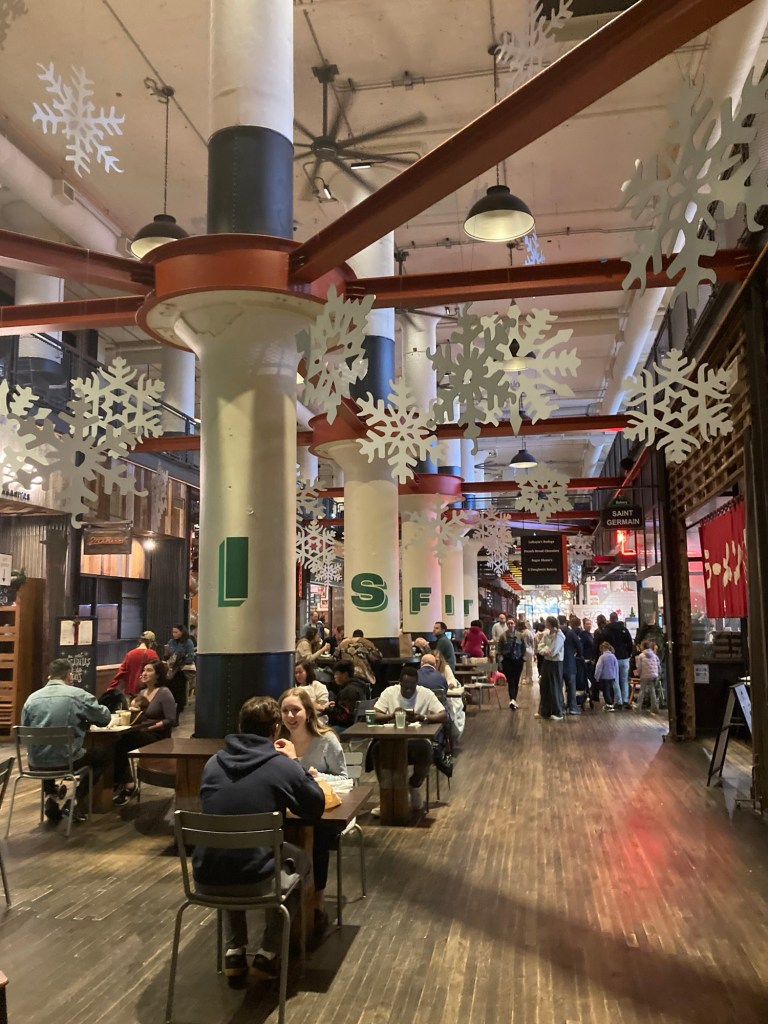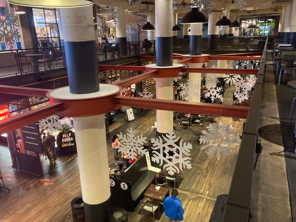 The market as viewed from the Beltline TrailMost of the retail and restaurants are on two floors. Looking down on the lower floor from above.A holiday selfie spotW.H. Stiles Fish Camp restaurant A spiral staircase up advertising some of the stores aboveAnother restaurant, we were there between 11 am and noon, so things were just starting to pick upFun signageOne of the establishments you could frequent if you followed the sign aboveThe very cute Atrium restaurant Fun historical decorThe seating area for La Metro, a Spanish tapas restaurant we hope to visit before we leaveThe lower floor of the market A closer view of one of the entrances
