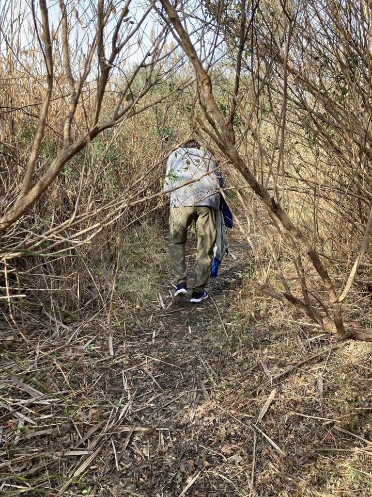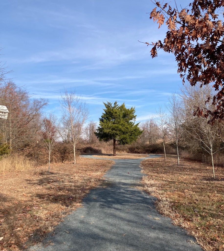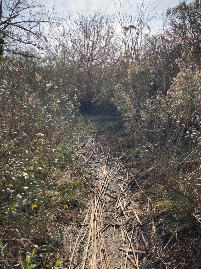 1st time we’d seen the term “dog nuisances”This path just went around the green tree with its leaves.Although, we did see this as well, but weren’t sure we were looking at a camera, bird house/feeder, or something else.Another path went into brush that we followed for awhileUntil we decided we’d rather walk standing upLoving the weather!