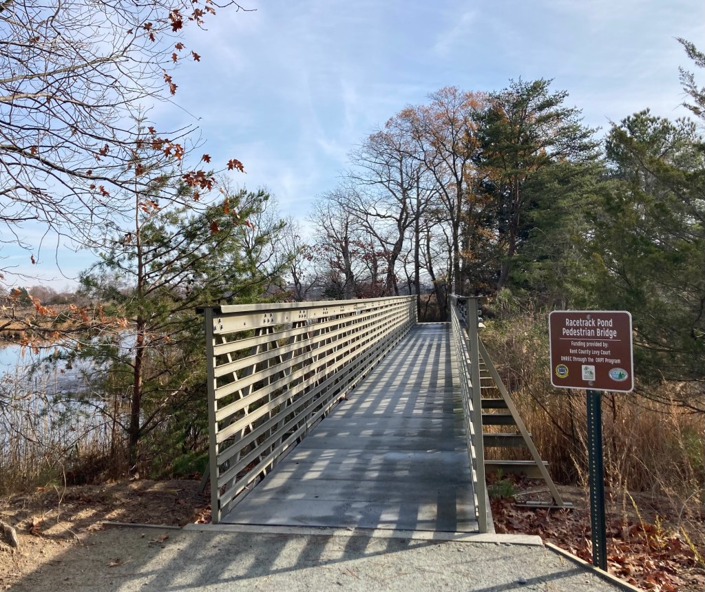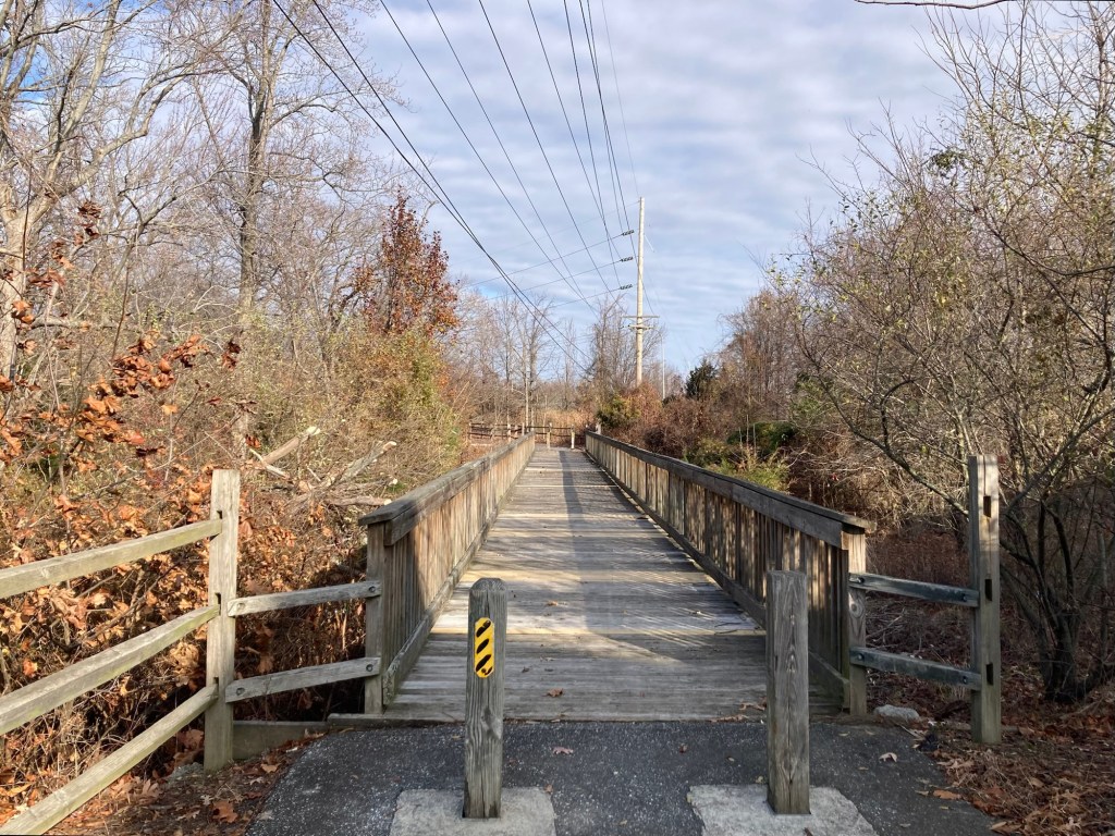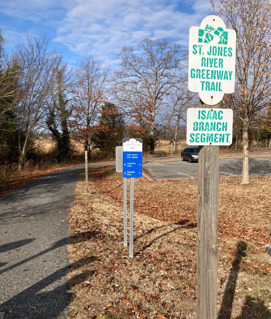 Crossing the St. Jones River on the way to the trailheadThe trailhead One view of the Isaac Branch of the RiverWe were there.A bridge (not) too farThere were distance markers every .1 mileAn unexpected place for a fire hydrantA heads up notice on the bridge. I hope he brings gifts.The last sign destination marker we passed before turning around