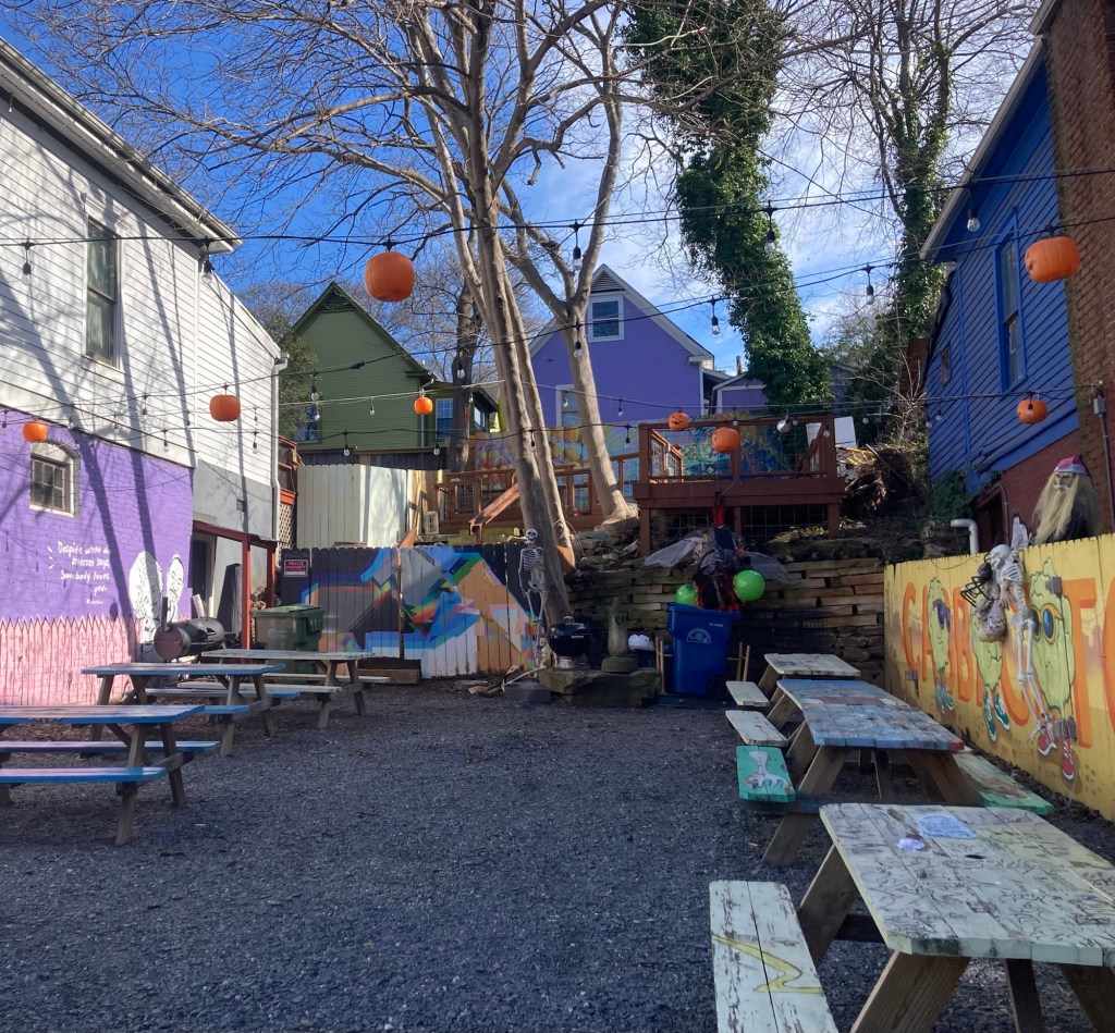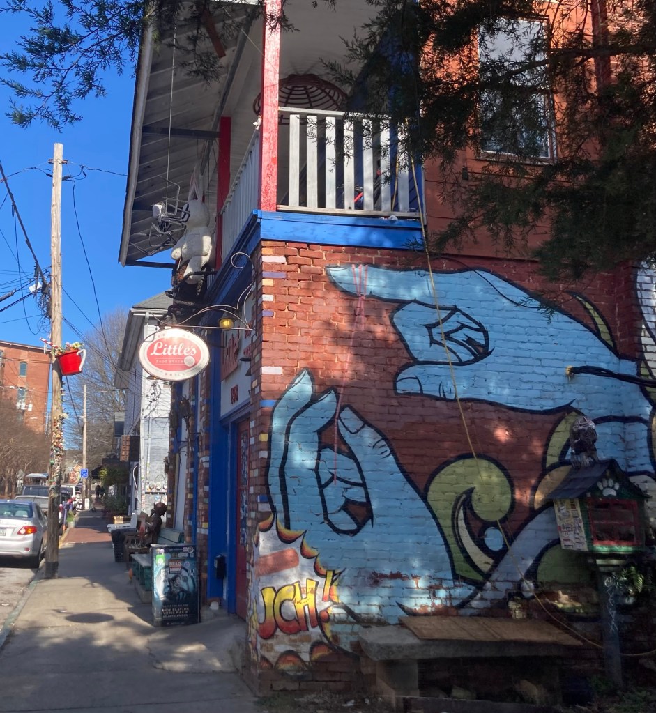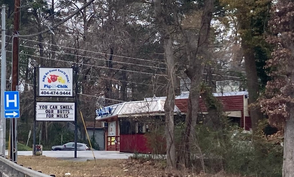 One of the small, neighborhood shopping areas near where we’re staying. A marker to a Civil War battle One of the more unique Christmas yard decorations in the lovely neighborhoods we walked throughAnd then a restaurant advertisement that caught our eye
