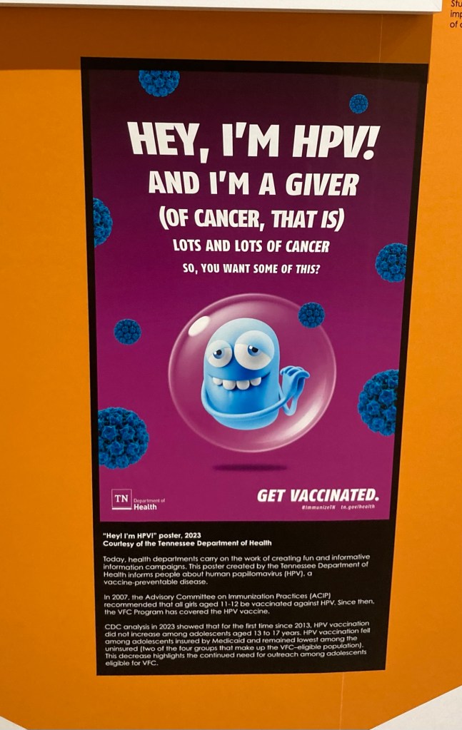 A sample poster to help increase vaccinations This was from the health inequality exhibit comparing disease rates between native and non-native populations in AlaskaA call to actionThis was sadly impactful— shawls covering empty chairs to indicate missing or murdered Indigenous women and girls Some of the historical information Part of the AIDS exhibit Good health remindersThis was part of an interesting exhibit on projects created by the different classes of the Epidemic Intelligence Service. The footprint is used to convey the amount of walking required in field investigations of diseases.