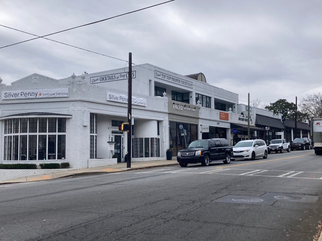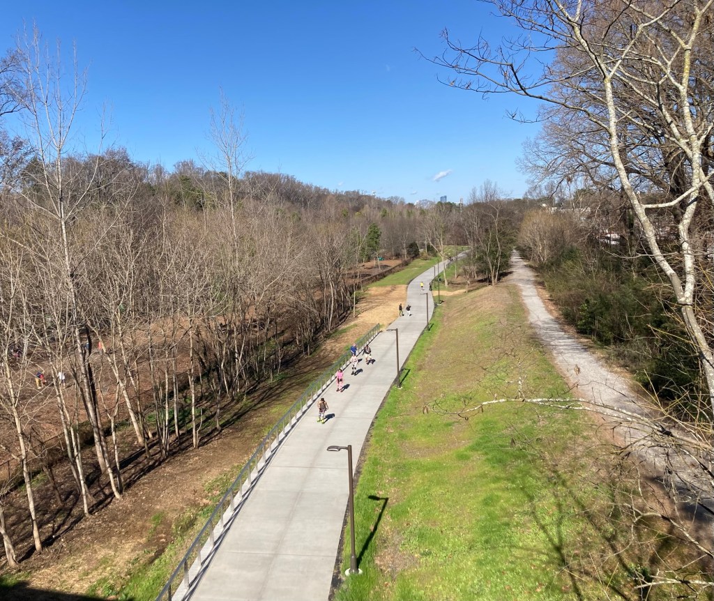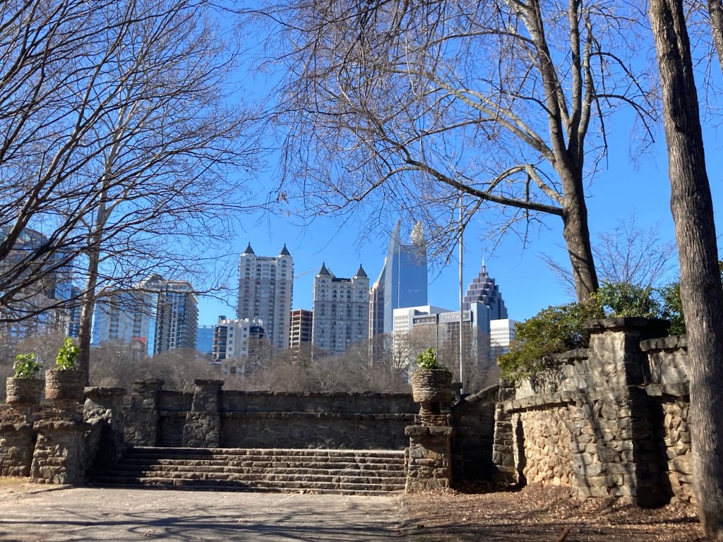 Walking on a bridge over the Beltline trail to Piedmont ParkLooking across Piedmont Park towards downtown A colorful entrance to a Thai restaurant A residential building near the theater