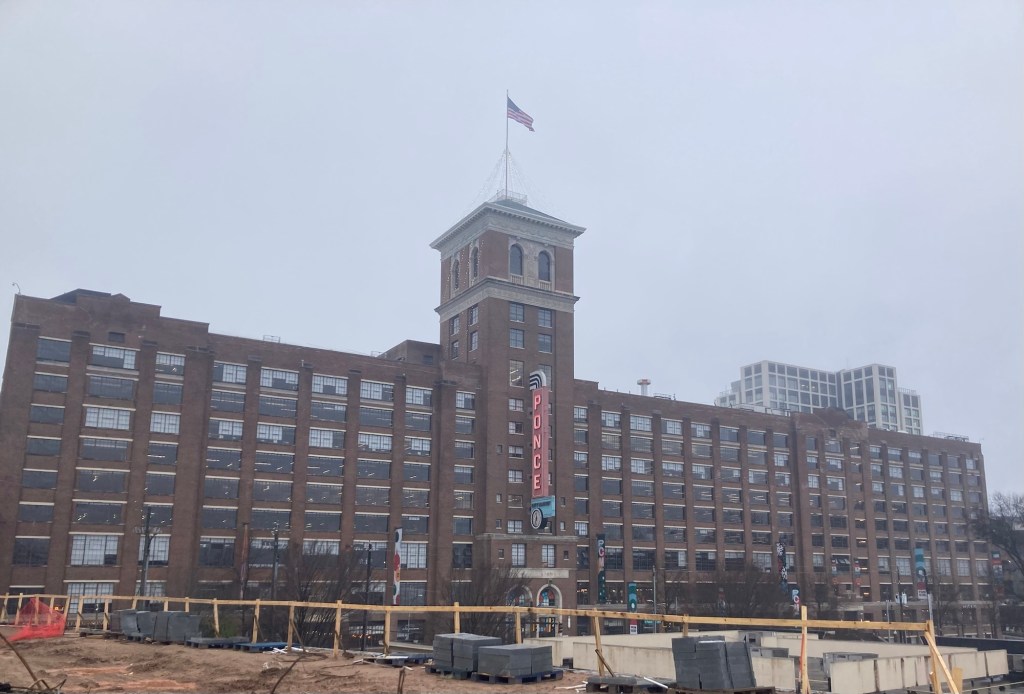 Heading down the 22 mile loop Beltline Trail to the Ponce Market on a cloudy/misty day.Some bike decor along the trail with the Ponce Market in the background