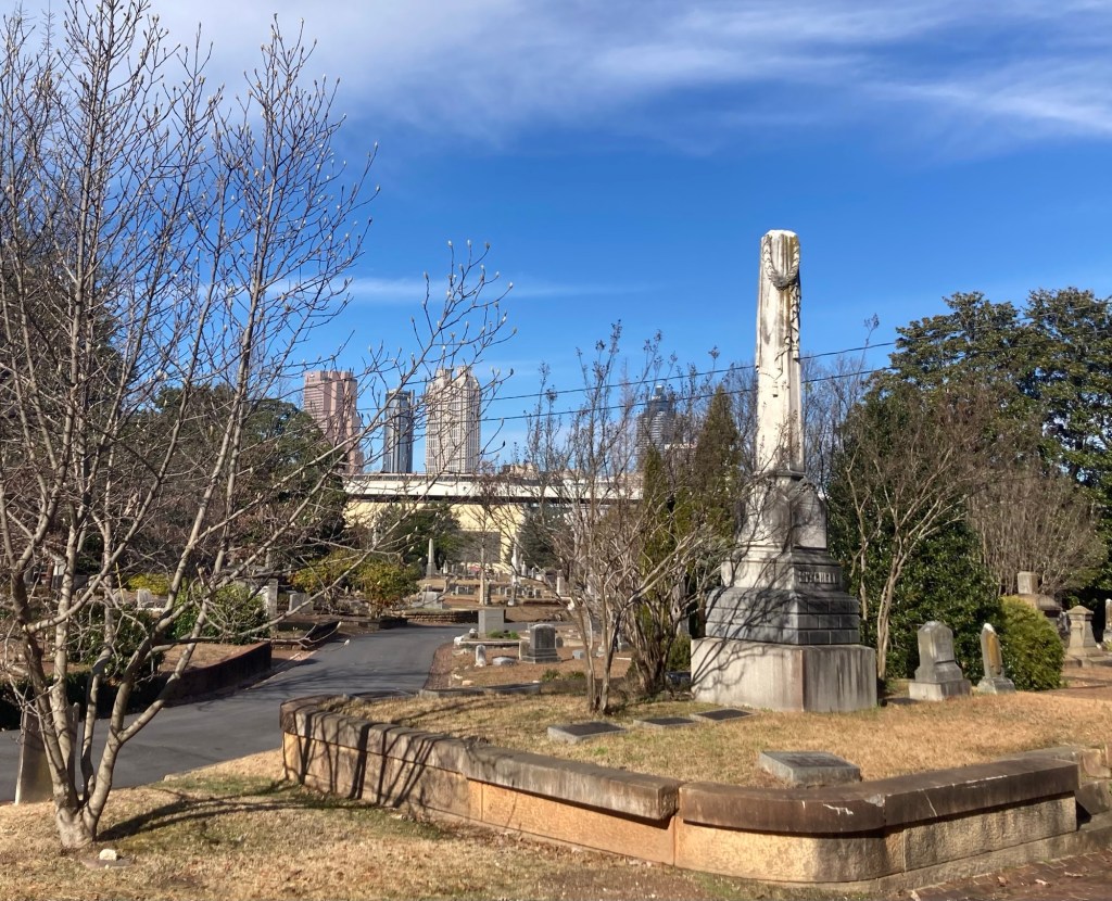 Walking on an overpass with a good view towards downtownThe MLK Branch Library with one of his quotesThe front gate of the cemeterySome of the headstones at the entrance to the cemetery An impressive looking mausoleum DittoLooking across the cemetery towards downtown This mausoleum houses Atlanta Mayor Charles Collier (1848-1900), his daughter, Julia, and her husband Julian Harris, who was the son of “Uncle Remus” author Joel Chandler Harris. Julia and Julian also owned the Columbus Enquirer-Sun that won the 1926 Pulitzer Prize for journalism.The bell tower, which originally housed a receiving vault for caskets and an office for the Sexton, who oversaw the cemetery. It currently houses the Visitors Center.The burial spot of Margaret Mitchell (1900-1949), author of Gone with the Wind, and her husband John Robert Marsh.The black granite monument for Mayor Maynard Holbrook Jackson (1938-2003), Atlanta’s first African American mayor. He served 3 terms and was instrumental in bringing the 1996 Olympics to Atlanta and expanding the airport, which now bears his name.The grave of Bobby Jones (1902-1971), considered the greatest amateur golfer of all time. In 1930, after winning golf’s Grand Slam, he retired. He co-designed Augusta National golf course.The monument for Kenny Rogers, one of the bestselling musicians of all time. He had 24 number 1 hits and 3 Grammy awards.Part of the confederate burial grounds in the cemetery The obelisk to the confederate deadThis mausoleum is home to Jacob Elsas (1842-1932), whose family owned the Fulton Bag and Cotton Mills until the 1960s. The former mill is now a residential community in Cabbagetown (see below).
