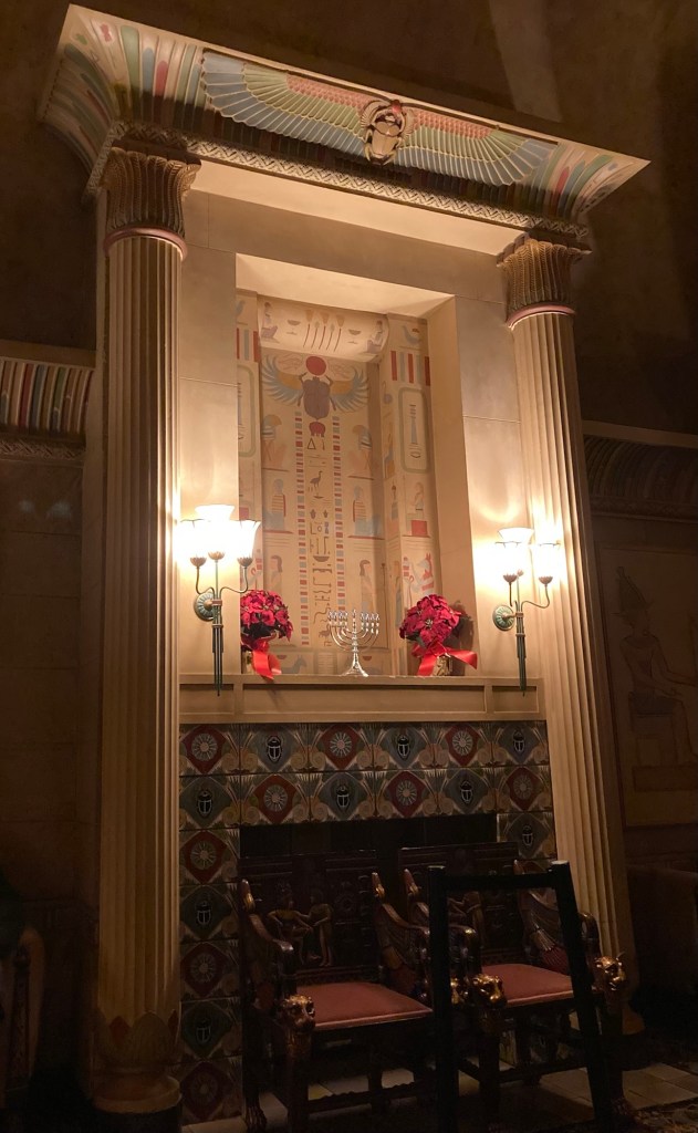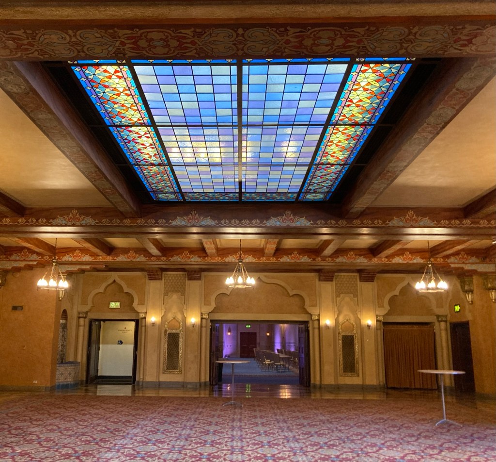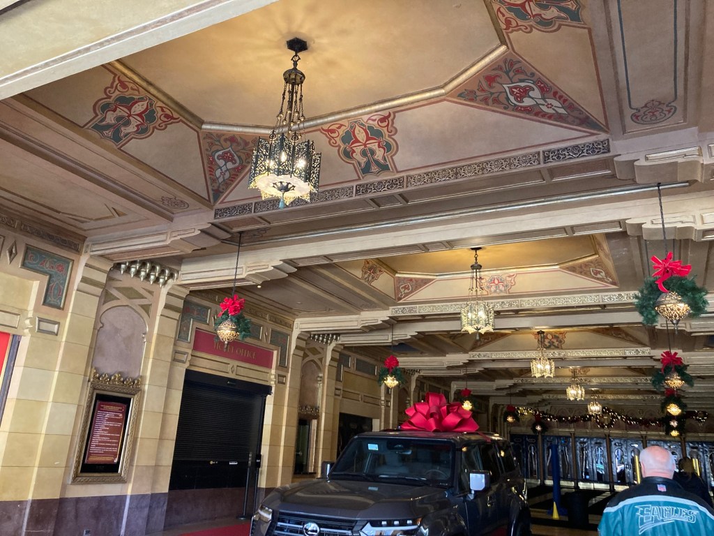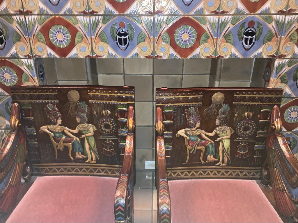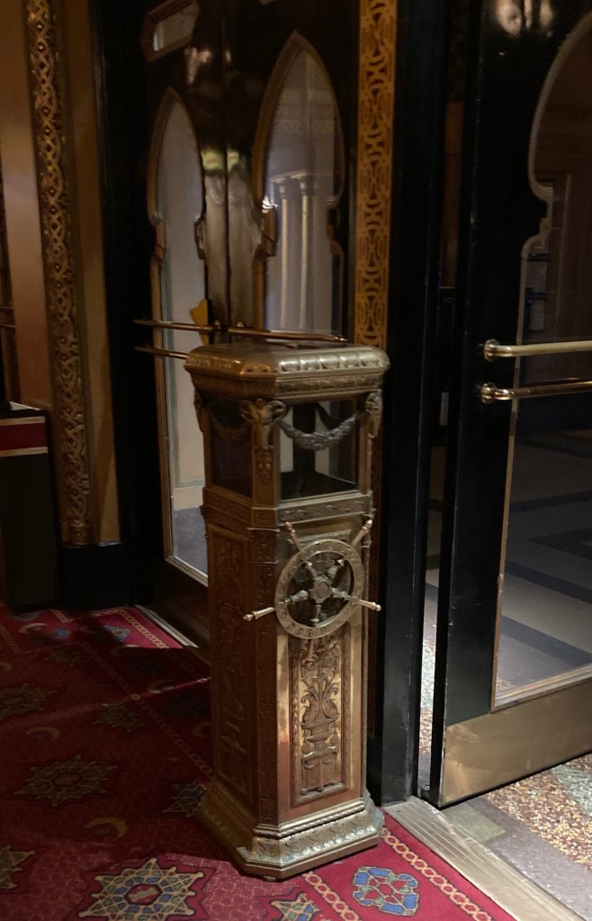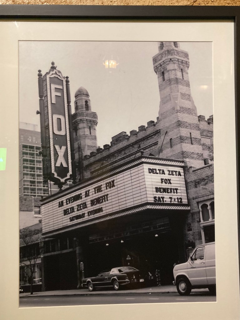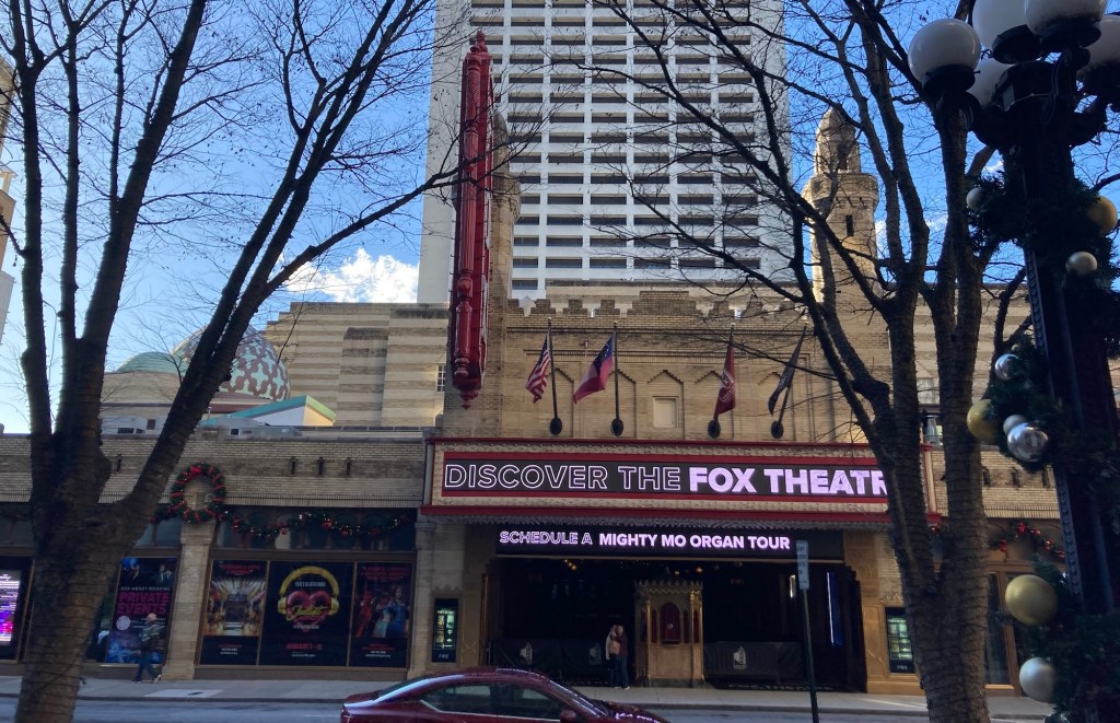 A photo of the Fox in the 1960s when they were having a benefit to keep the theater from being razed to make a parking lot for Southern Bell Telephone.The Fox Theatre todayThe external lobby for the theaterA sign in the external lobby that shows the location of the theater at Peachtree St and Ponce de Leon AveThe lobby of the theater The old ticket box where the staff would collect the tickets at the doorThe stage in the auditorium. The highlighted Parton the left is not boxed seats but covering for the pipes for the Mighty Mo organ.The large canopy over the back of the auditorium The auditorium carpet, the Jewish star for William Fox and the moon and star for the Shriners.A decorative wall in the the women’s loungeA close up of the mantel tiles and the King Tut chairsOne of the upstairs ballroomsThe Egyptian Ballroom, where they currently host proms and weddingsLooking onto the patio of their member’s club A look at the theater from across the street